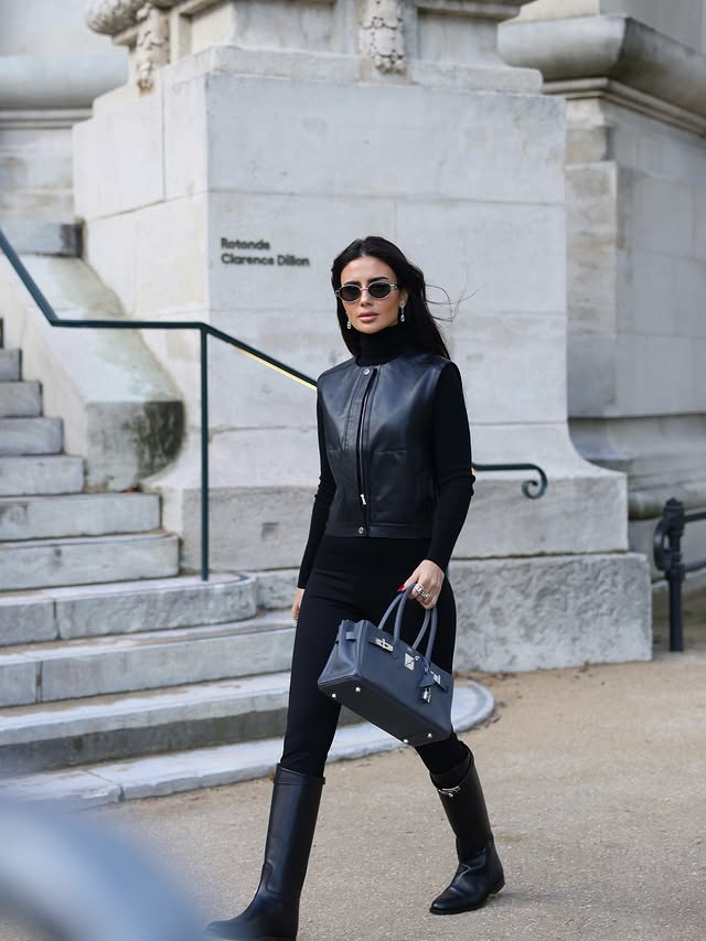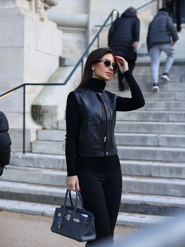 فاجأت ديما بأسلوب "مونوكروم" يجمع بين العملية والفخامة، مع كنزة بياقة عالية وجيليه جلدية قصيرة، وحقيبة Birkin وبوت عالي، ما يعكس أناقة متقنة وراقية. أكملت الإطلالة بشعر مسترسل ونظارات شمسية عصرية لإطلالة غامضة وأنيقة.