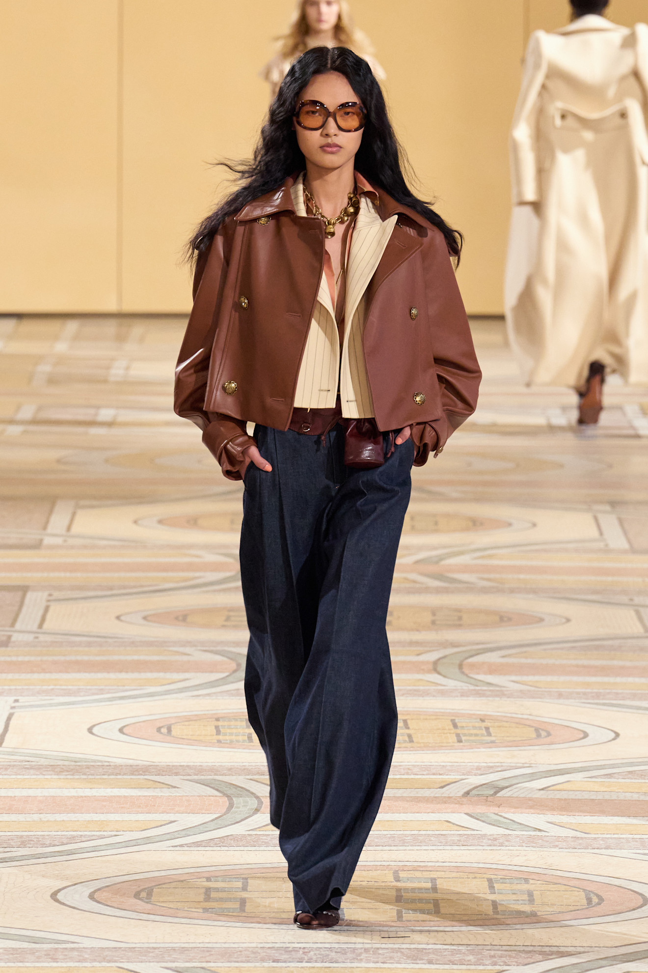الجاكيت الجلد من القطع الأساسية في كل موسم شتوي. مثال Zimmermann: جاكيت بني مبطن نسق مع سروال دنيم، لإطلالة عملية وعصرية مع دفء إضافي.