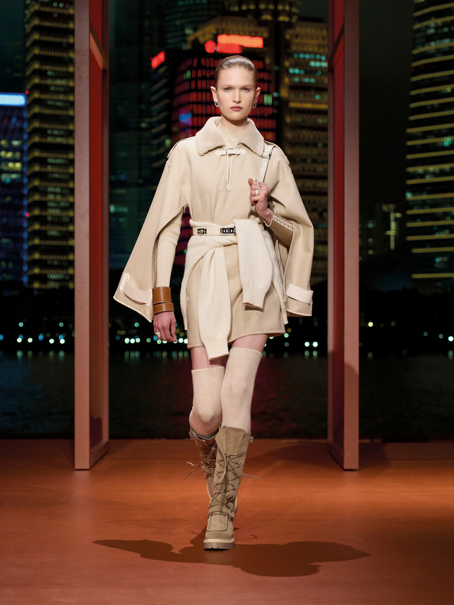 في Hermes، جاءت الربطة حول الخصر على معاطف خفيفة وكنزات صوفية، بأسلوب متوازن وراقي يبرز الذوق الكلاسيكي ويضيف تحديدًا ذكيًا للخصر دون إفراط.
