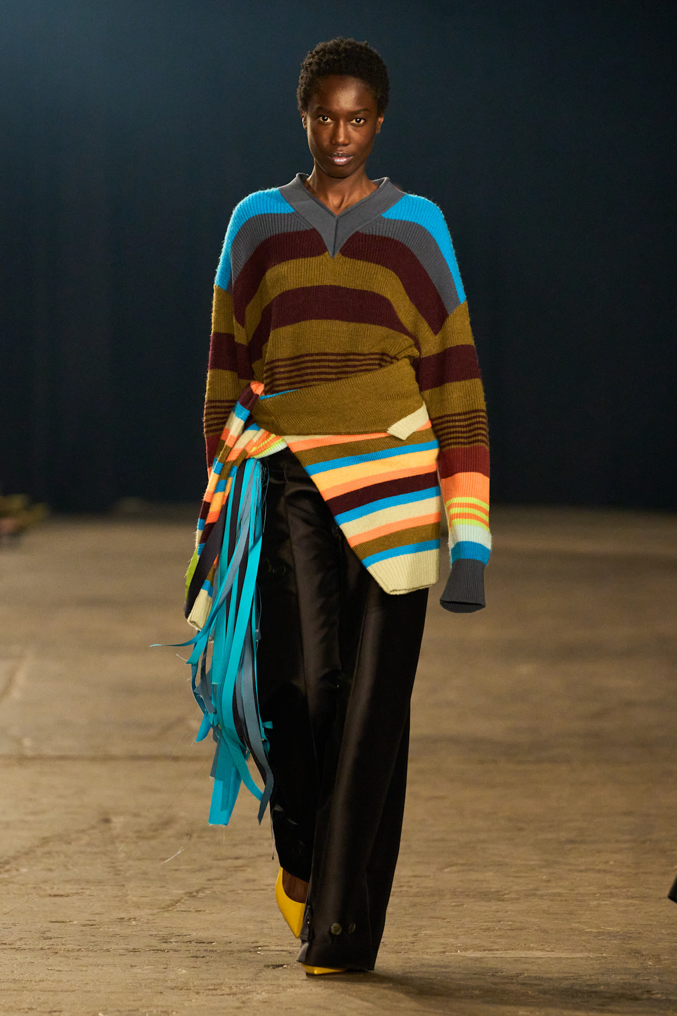 اعتمد كريستوفر جون روجرز على قطع ملونة مربوطة عند الخصر لإضفاء حركة وحرية على الإطلالة، مع توازن بين العشوائية المدروسة والأناقة المريحة.