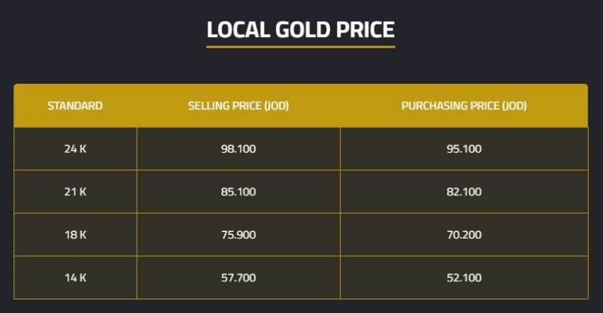 أما أسعار بيع الذهب للعيارات الأخرى، فقد سجل سعر غرام عيار (24) في محال الصاغة 98.10 دينارا، في حين بلغ سعر بيع غرام الذهب من عيار (18) 75.9 دينارا، وعيار (14) بلغ سعره 57.70 دينارا.