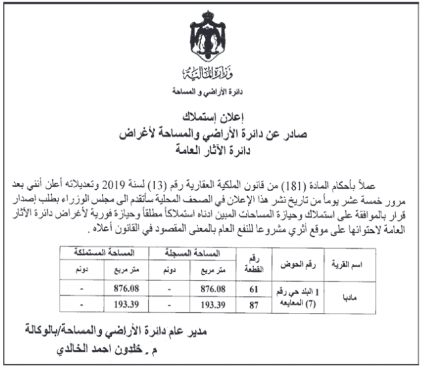 للعلّم - أصدر مدير عام دائرة الاراضي والمساحة بالوكالة المهندس خلدون الخالدي، إعلانًا رسميًا يؤكد عزمه تقديم طلب استصدار قرار من مجلس الوزراء للموافقة على استملاك وحيازة قطعتي أرض في منطقة "حي المعايعة" في مدينة مادبا.