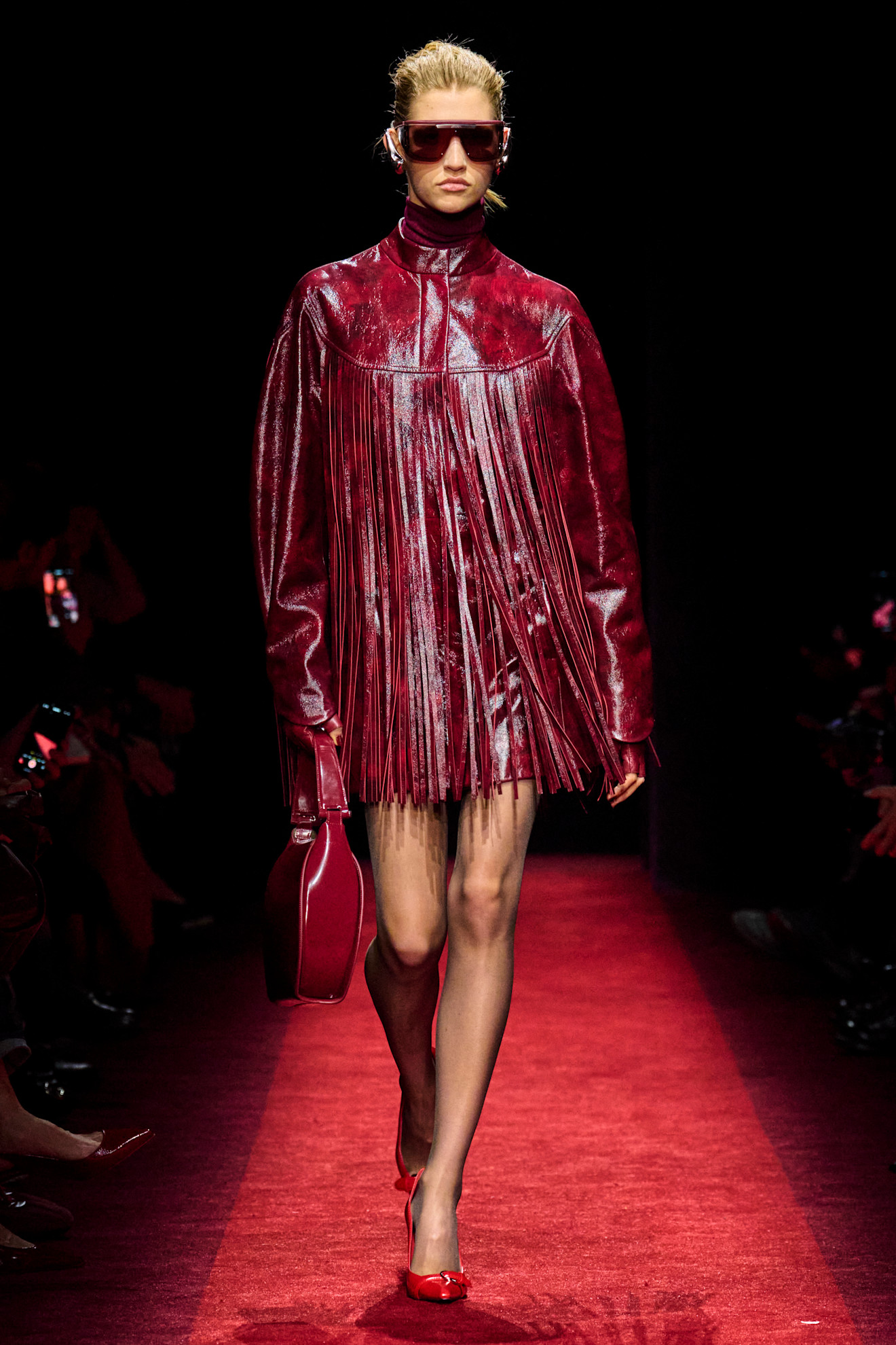 الفساتين الطويلة، الميدي، أو القصيرة، جميعها تستفيد من الشراريب في هذا الموسم. إطلالة من Ferrari قدمت فستانًا أحمر من الجلد مع شراريب منسدلة بنفس القماش واللون، ما أضاف حركة وأناقة للوك، وجعل الإطلالة جريئة ومميزة للسهرة أو المناسبات الرسمية.