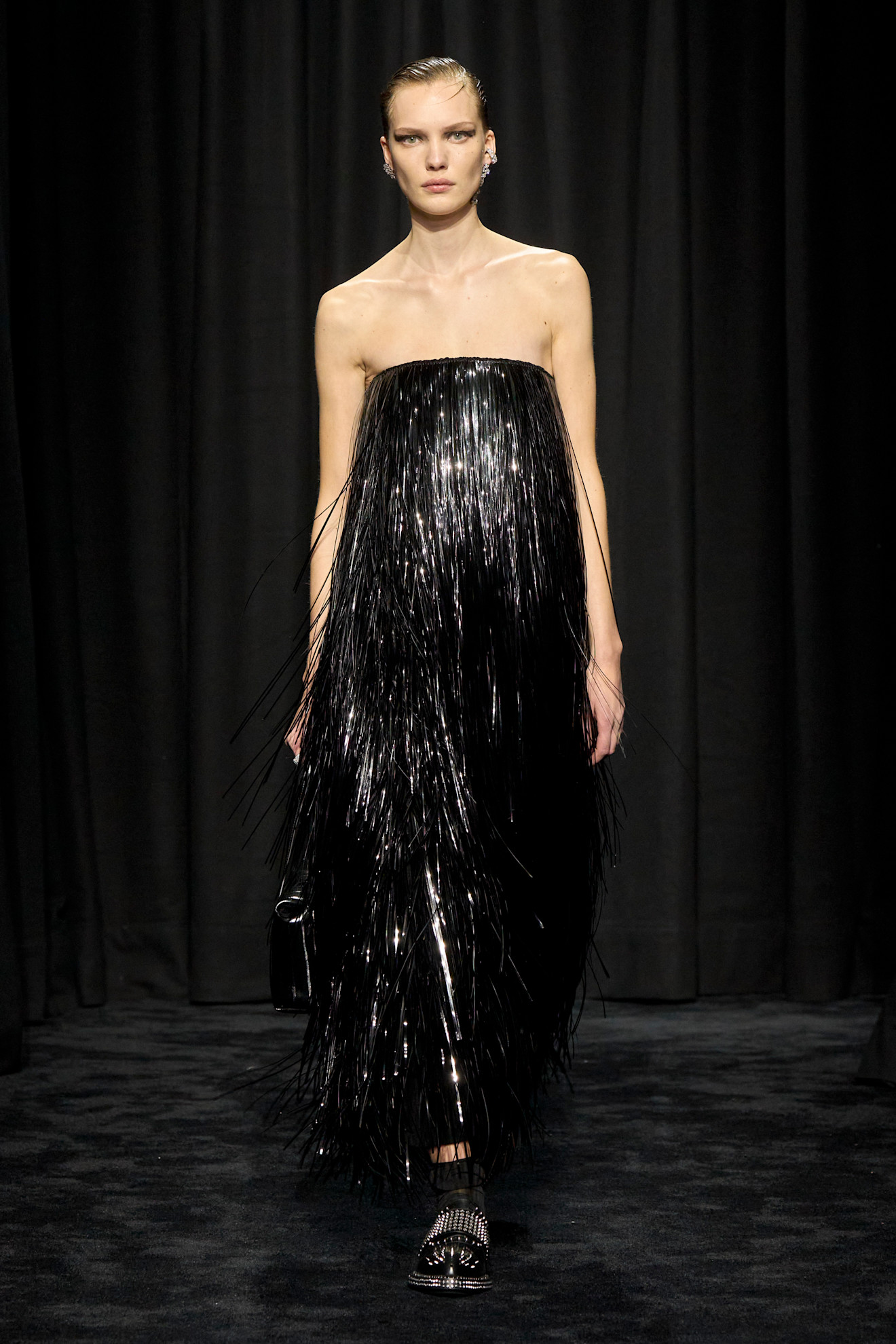 فستان الشراشيب البرّاقة من "جيل ساندر" أضفى بعدًا دراميًا على الحركة، حيث خلق إيقاعًا بصريًا مع كل خطوة، فبدا القماش وكأنه يرقص.