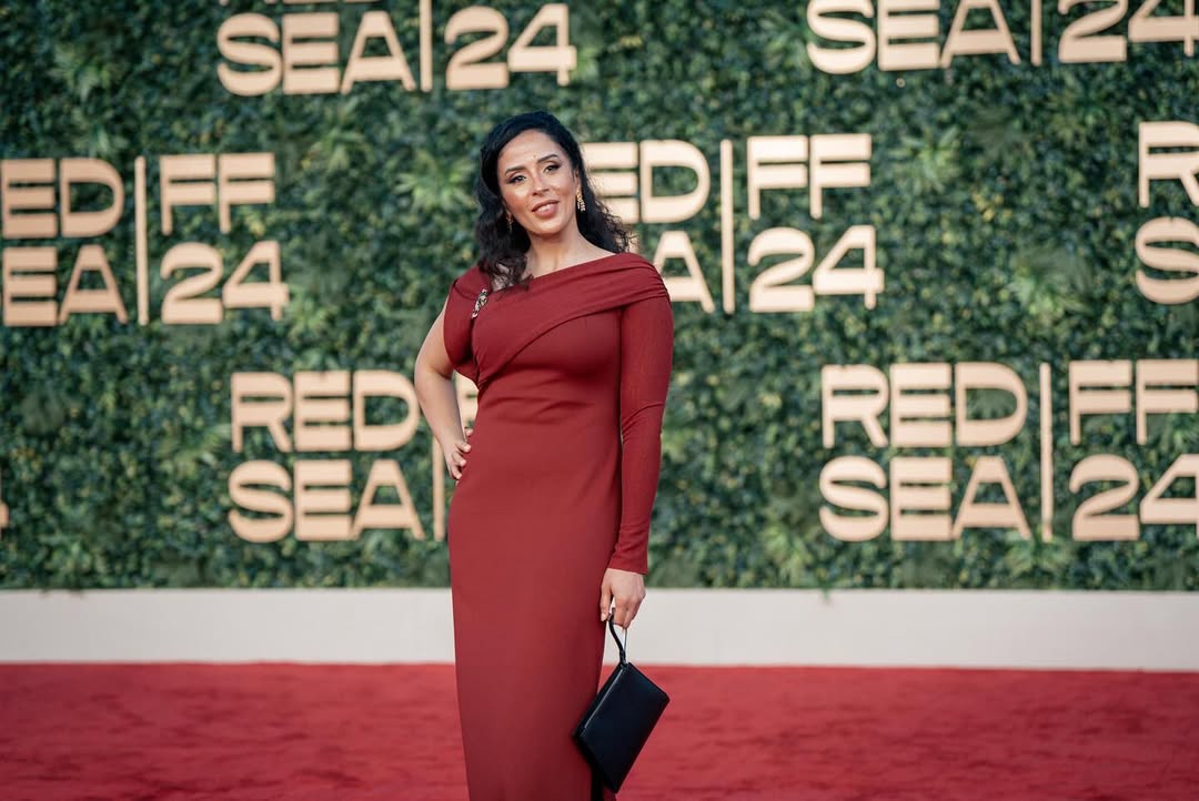 عائشة كاي: ارتدت فستانًا أحمر طويل مزود بكم وحيد وفتحة ياقة مائلة، مع بروش أنيق، ونسقت معه كلاتش أسود، ليبرز الفستان جمال اللون الأحمر بطريقة هادئة ومؤثرة.