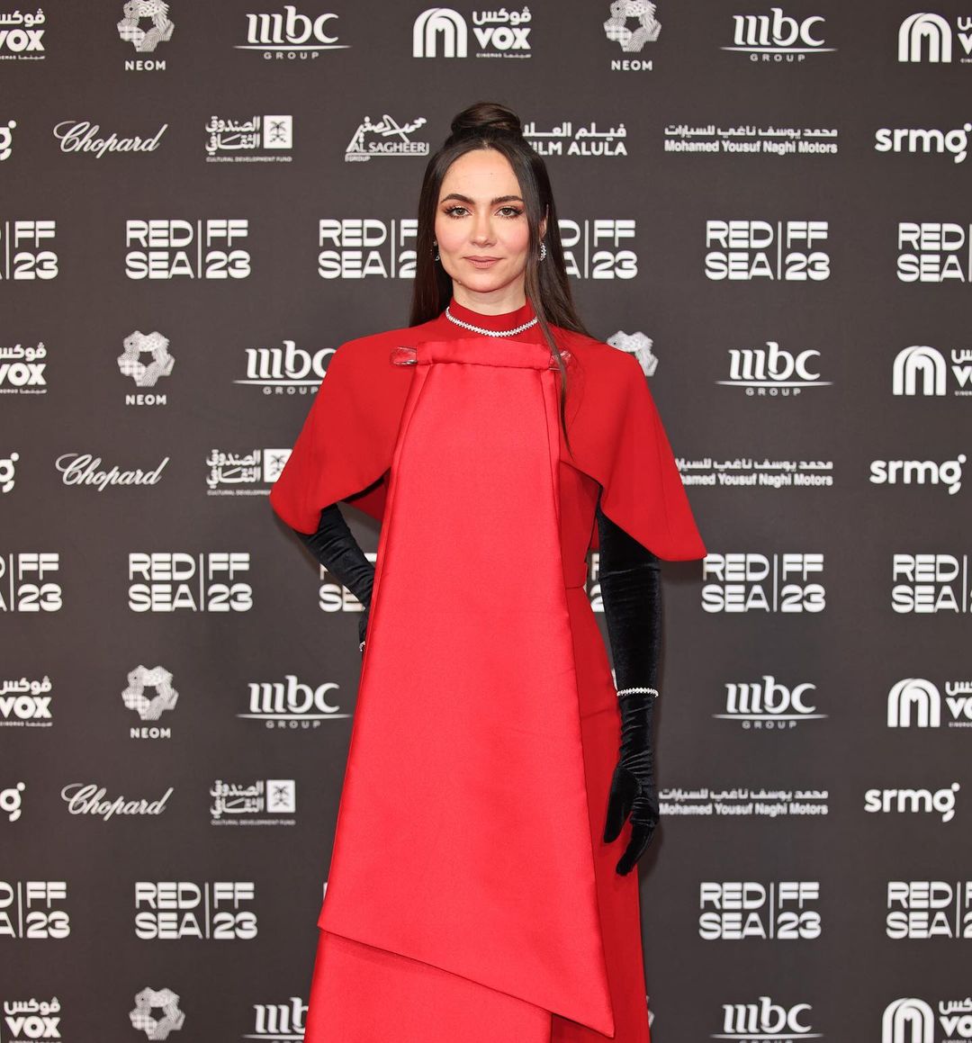 سمية رضا: أبهرت الجميع بفستان أحمر طويل يجمع بين الجرأة والأناقة المعمارية، مع تصميم هندسي وقفازات سوداء لامعة، وطبقات خفيفة تنسدل بانسيابية، مع عقد لؤلؤي قصير أضاف لمسة كلاسيكية على الإطلالة.