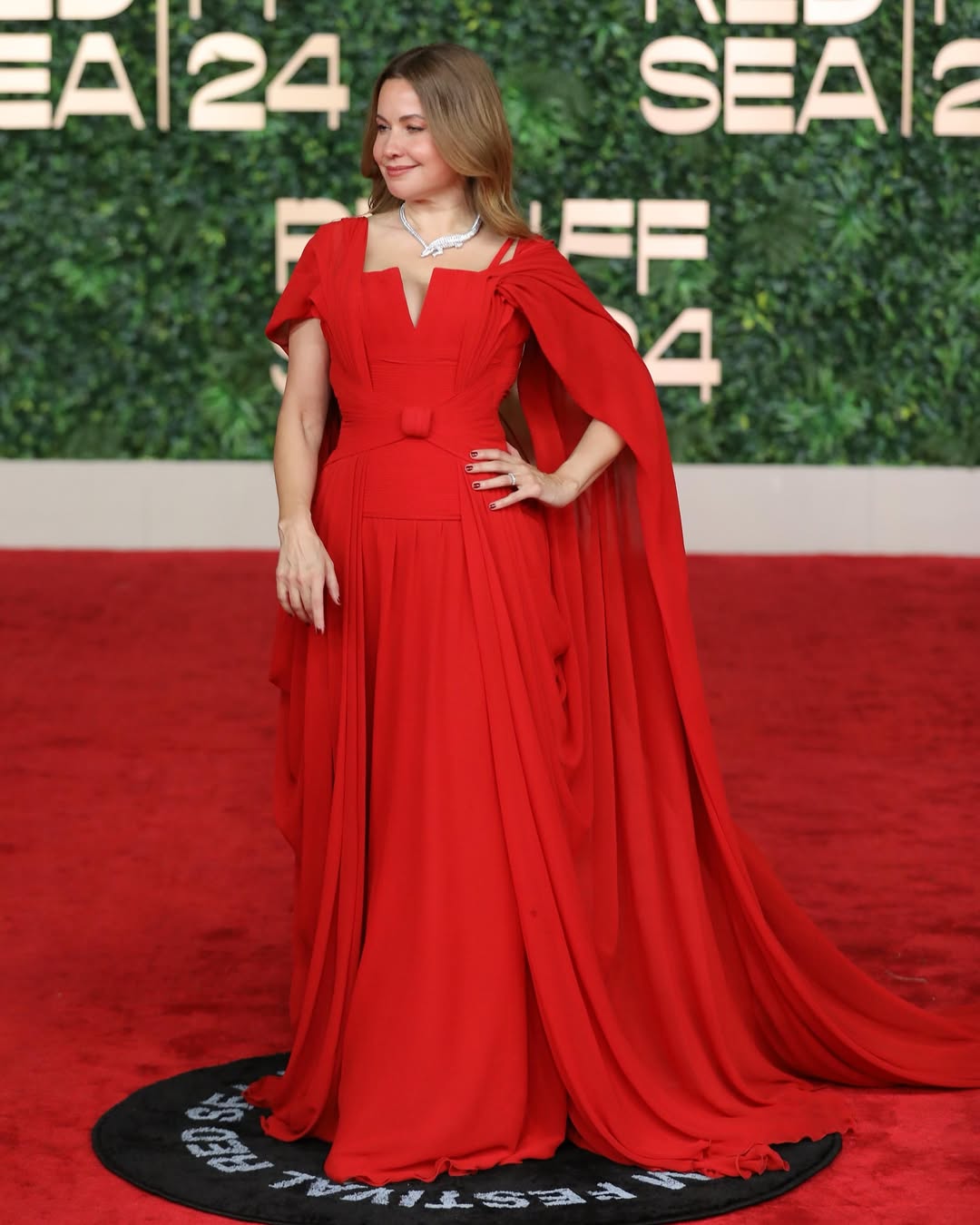 أليساندرا أمبروسيو: الفستان الأحمر الطويل مع ياقة عالية وأكتاف عريضة وثنيات جانبية، إضافة إلى فتحة ساق عالية، جعل إطلالتها متفردة على السجادة الحمراء، مع تنسيق مجوهرات ماسية وصندل فضي رفيع.