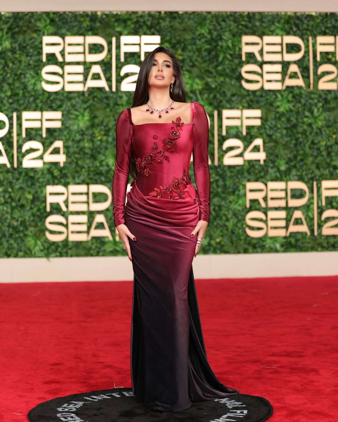 لجين عمران: ارتدت فستانًا أحمر من شربل كرم مزود بأكمام طويلة ووشاح يمتد بطول الفستان، مع تحديد خصر واضح وثنيات غنية، مما منحها إطلالة متوازنة بين الفخامة والبساطة.