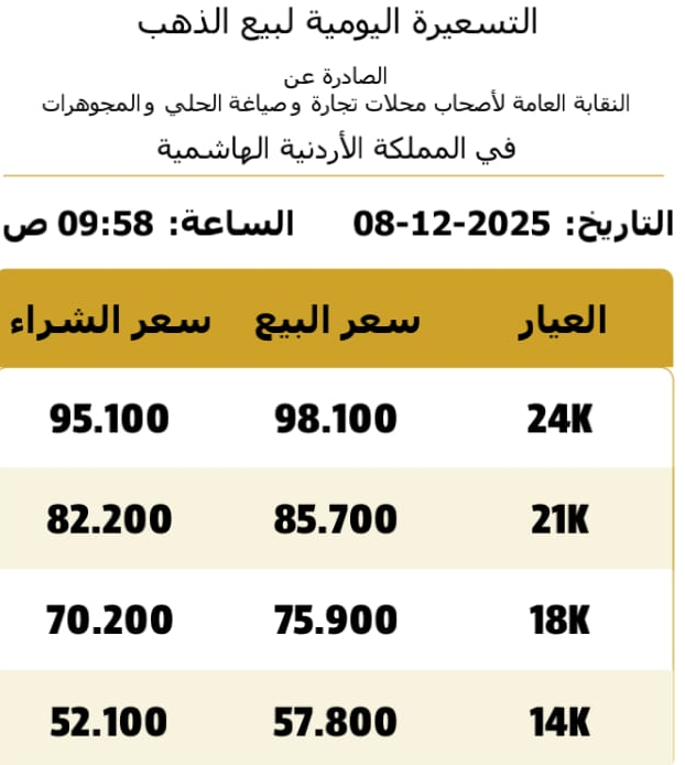 وحسب النشرة اليومية التي أصدرتها النقابة العامة لأصحاب محالّ تجارة وصياغة الحلي والمجوهرات، بلغ سعر الغرام الواحد من الذهب عيارات 24 و18 و14 لغايات البيع من محالّ الصاغة 98.1 و75.9 و57.8 دينارا على الترتيب.