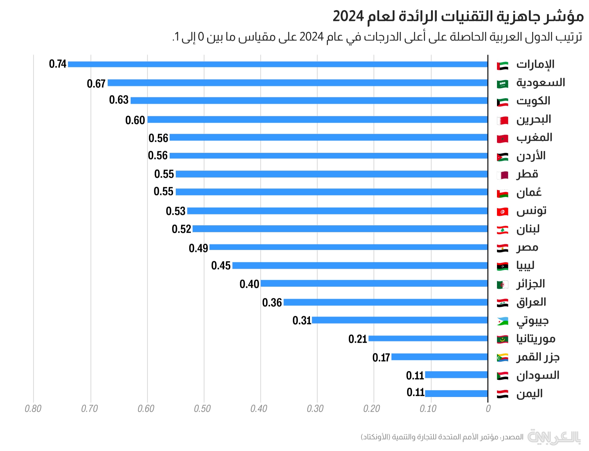 ويتضمن التقرير مؤشر جاهزية التقنيات الرائدة الذي يقيس أداء 170 اقتصادًا حول العالم، حيث تصدرت الولايات المتحدة والسويد والمملكة المتحدة القائمة لعام 2024 بنتائج مرتفعة على مقياس من 0 إلى 1.