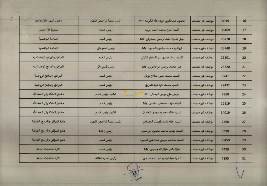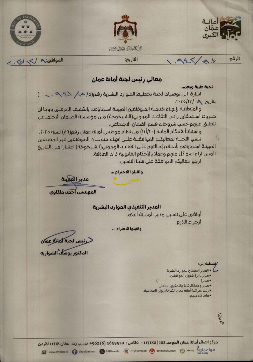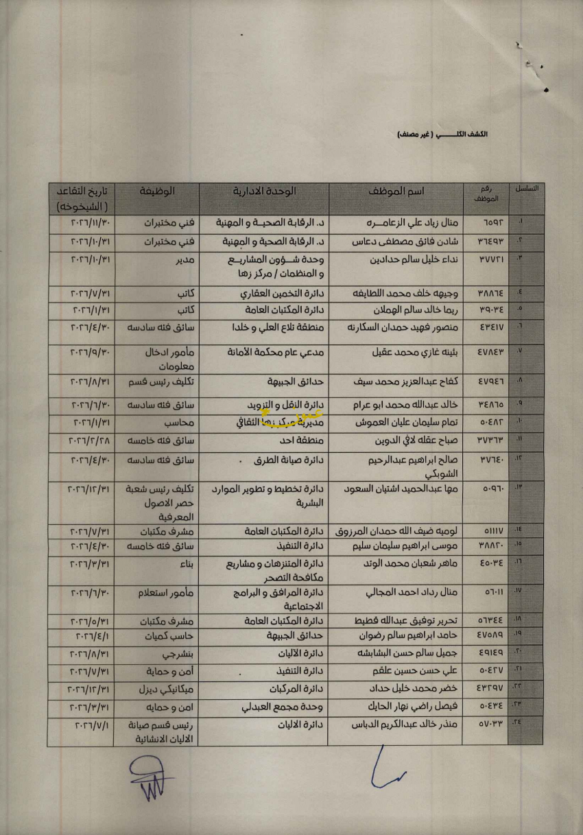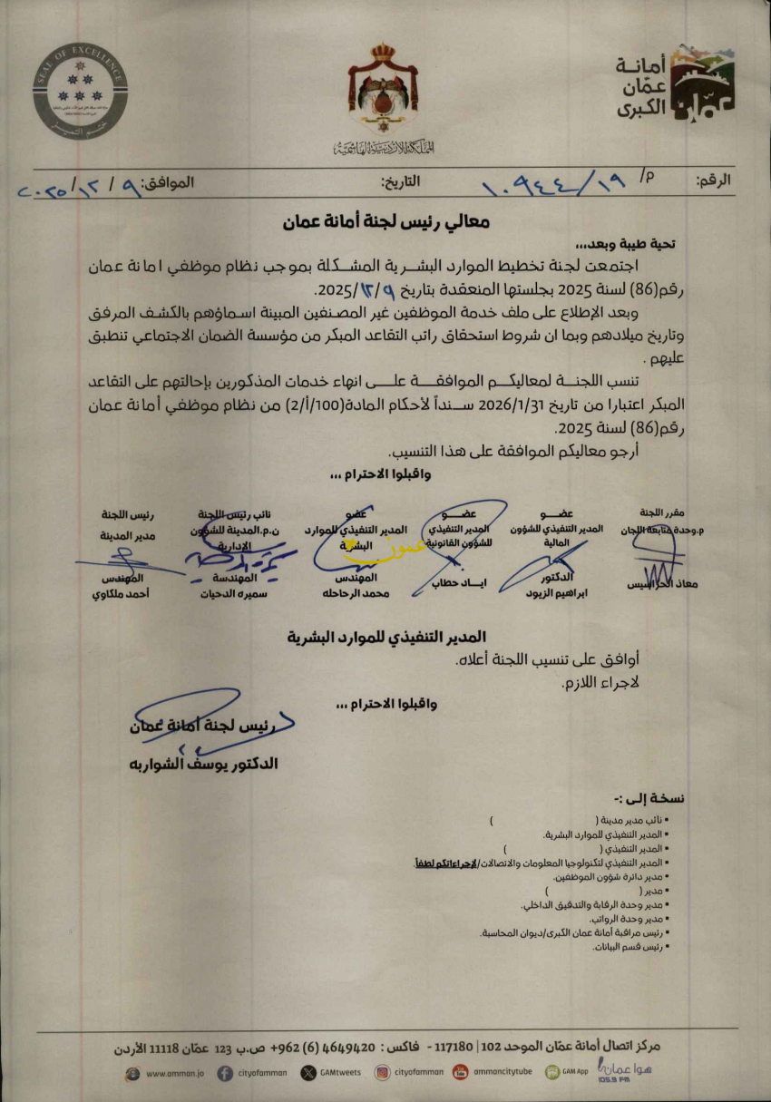 للعلّم - قرر رئيس لجنة أمانة عمان الكبرى الدكتور يوسف الشواربة، إحالة 74 موظفا إلى التقاعد المبكر اعتبارا من تاريخ 31/1/2026.