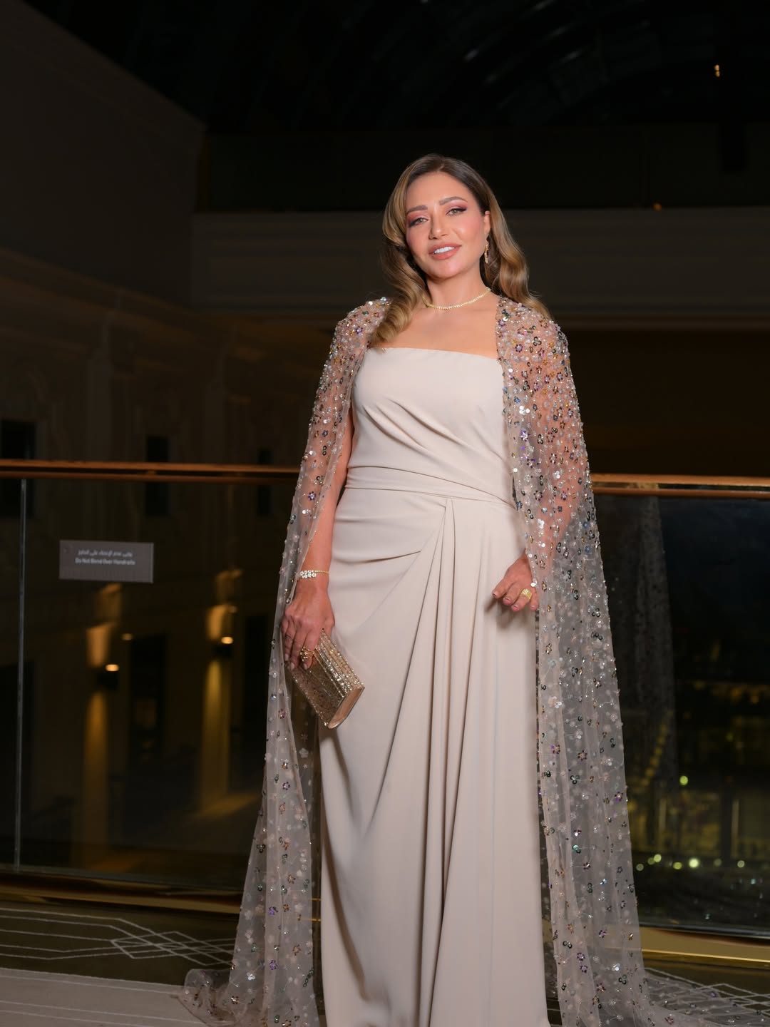لفتت ليلى علوي الأنظار بفستان نيود راقٍ بقصة مستقيمة من جيمي معلوف، تكمّله قطعة كاب شفافة مزدانة بالترتر والأحجار المتناثرة التي أضفت توهجاً سماوياً حولها.