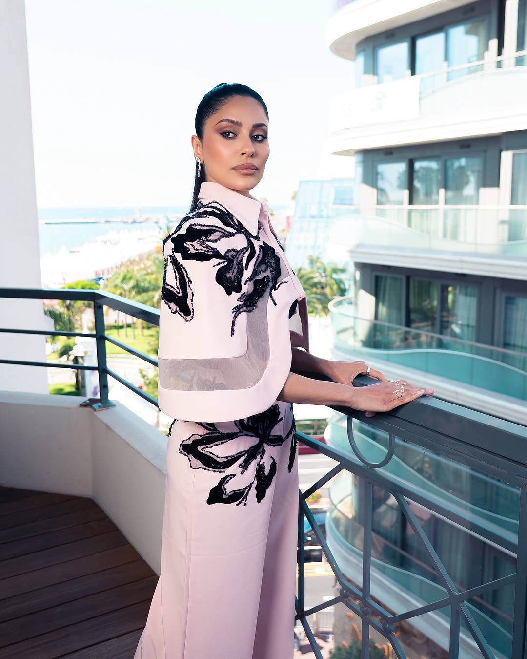 بدلة وردية من Eliane As Design: كاب قصير على الكتفين، بنطلون مستقيم مزين بتطريزات سوداء على شكل ورود، مجوهرات ناعمة من Alfardan Jewellery.