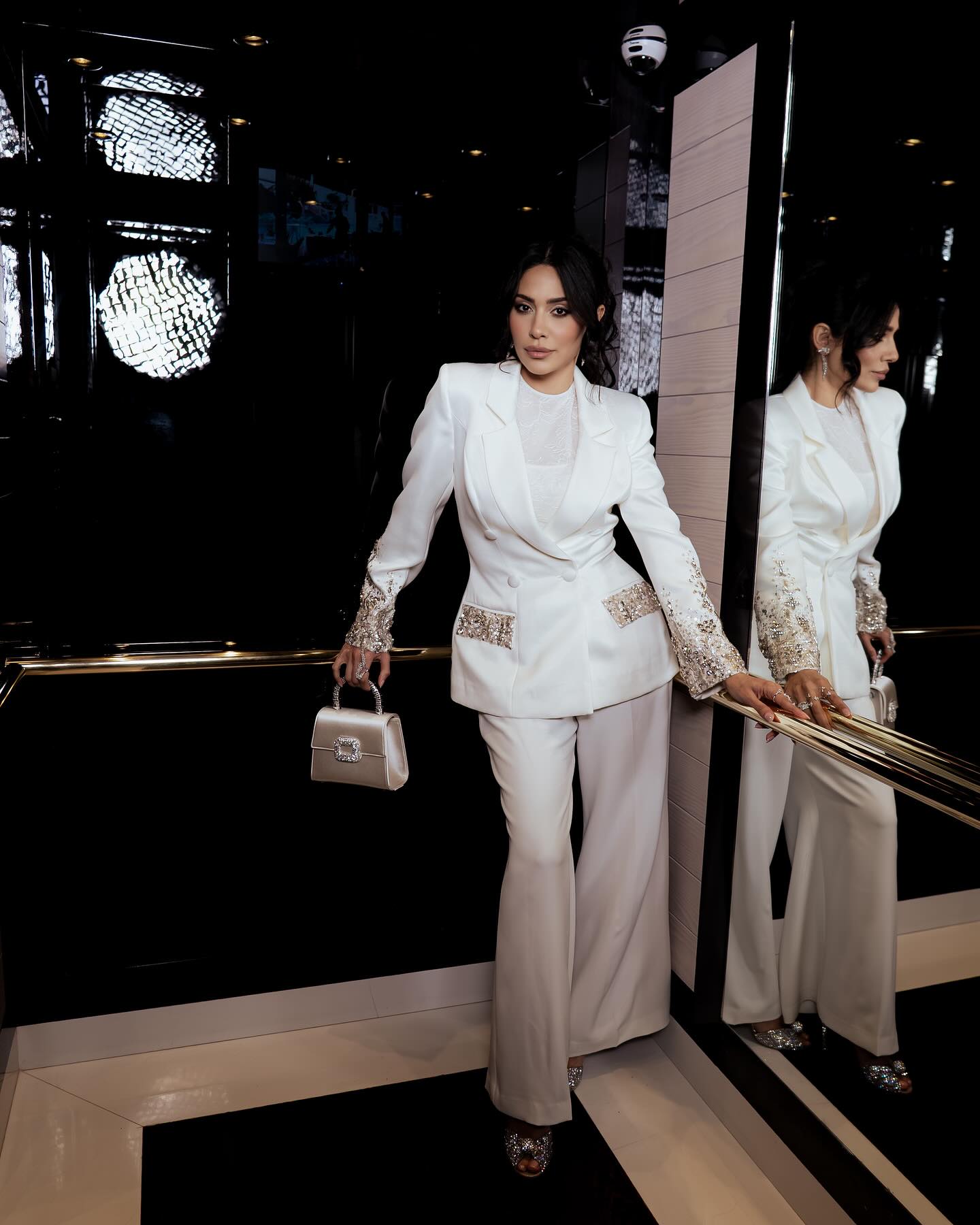 بدلة بيضاء مطرزة من Edmond Meslem: بليزر مزدوج الصدر مزين بتطريزات كريستالية، بنطال واسع، توب أبيض مطابق، حقيبة يد فضية وحذاء مرصع بالكريستال.