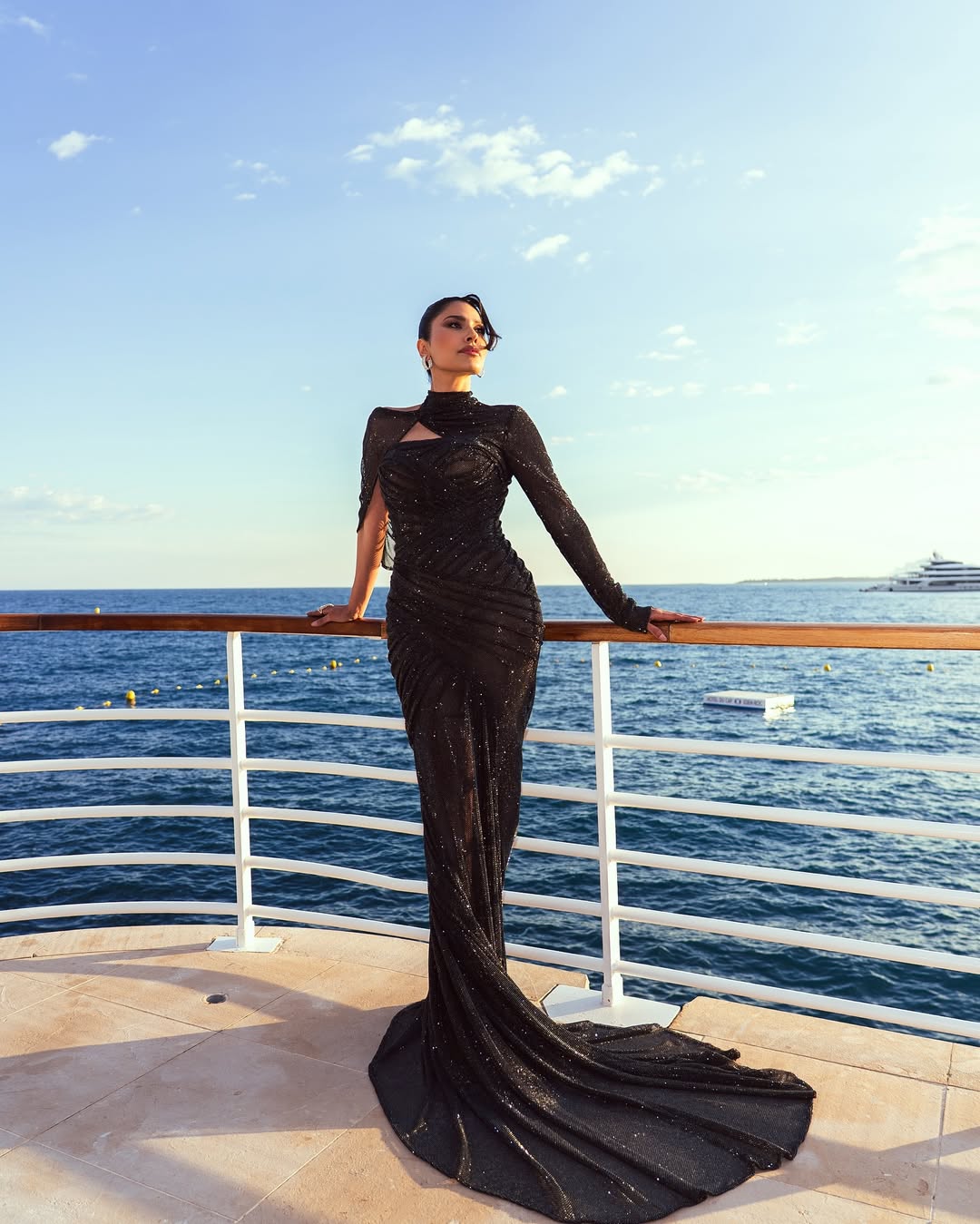 فستان أسود مرصع بالترتر من Antoine Kareh: مجسم على القوام مع تفاصيل فنية متداخلة وياقة عصرية، تألقت به في احتفالية Women in Cinema بمهرجان كان 2025.