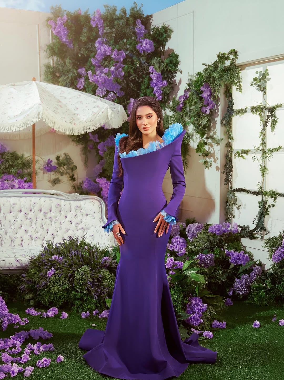 فستان بنفسجي من فؤاد سركيس: احتفالي بعيد ميلادها، طويل بقصة ضيقة مع شق أمامي، ولمسات زرقاء فاتحة على أطراف الأكمام وياقة الفستان، شعر منسدل وتموجات ناعمة، مكياج متوازن وشفاه نيود.