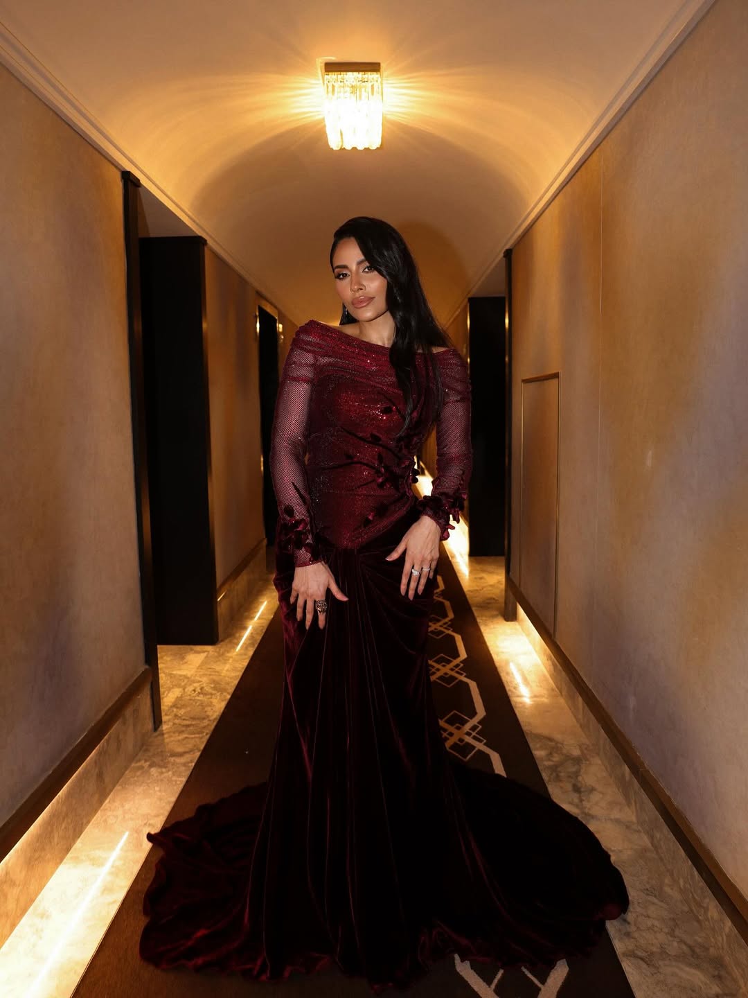 تألقت إلهام علي بفستان سهرة برغندي داكن مصمم خصيصًا من Antoine Kareh Couture، بقماش مخملي غني وذيل أنيق، مع دمج الأقمشة الشفافة والمطرزة على الجزء العلوي والأكمام الطويلة. أكملت المظهر بمجوهرات ماسية من Cartier، مكياج دافئ من Dior Beauty وتسريحة شعر منسدل بتنسيق خبيرة التجميل دينا العوايد، بإشراف الاستايلست Elim Chantaf.