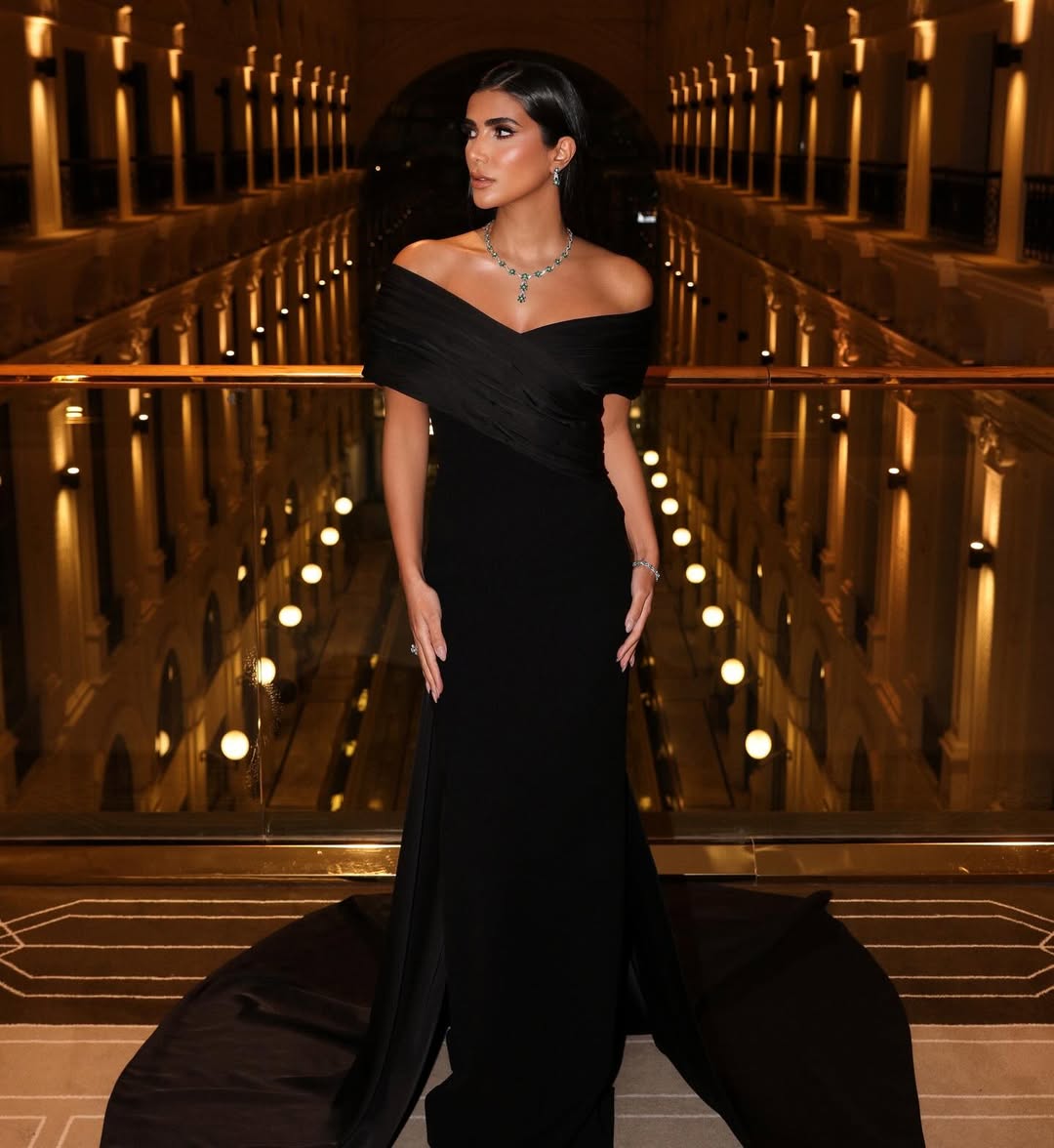 فستان أوف شولدر طويل بقصة محددة وناعمة، أطراف تلامس السجادة، نسقت معه كلاتش وحذاء أسود، وأكتفت بالأقراط الماسية الطويلة، مع شعر مموج مسحوب على الكتف.