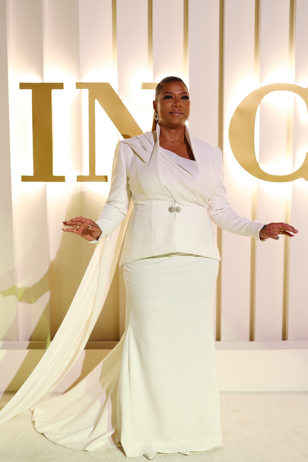 اعتمدت بدلة أنيقة تتكون من تنورة ماكسي مستقيمة وجاكيت مجسم بياقة عالية، مع وشاح متدلي يلتف حول الذراع، وزينت الإطلالة بأقراط براقة وخواتم، وشعر مرفوع على شكل ذيل حصان.