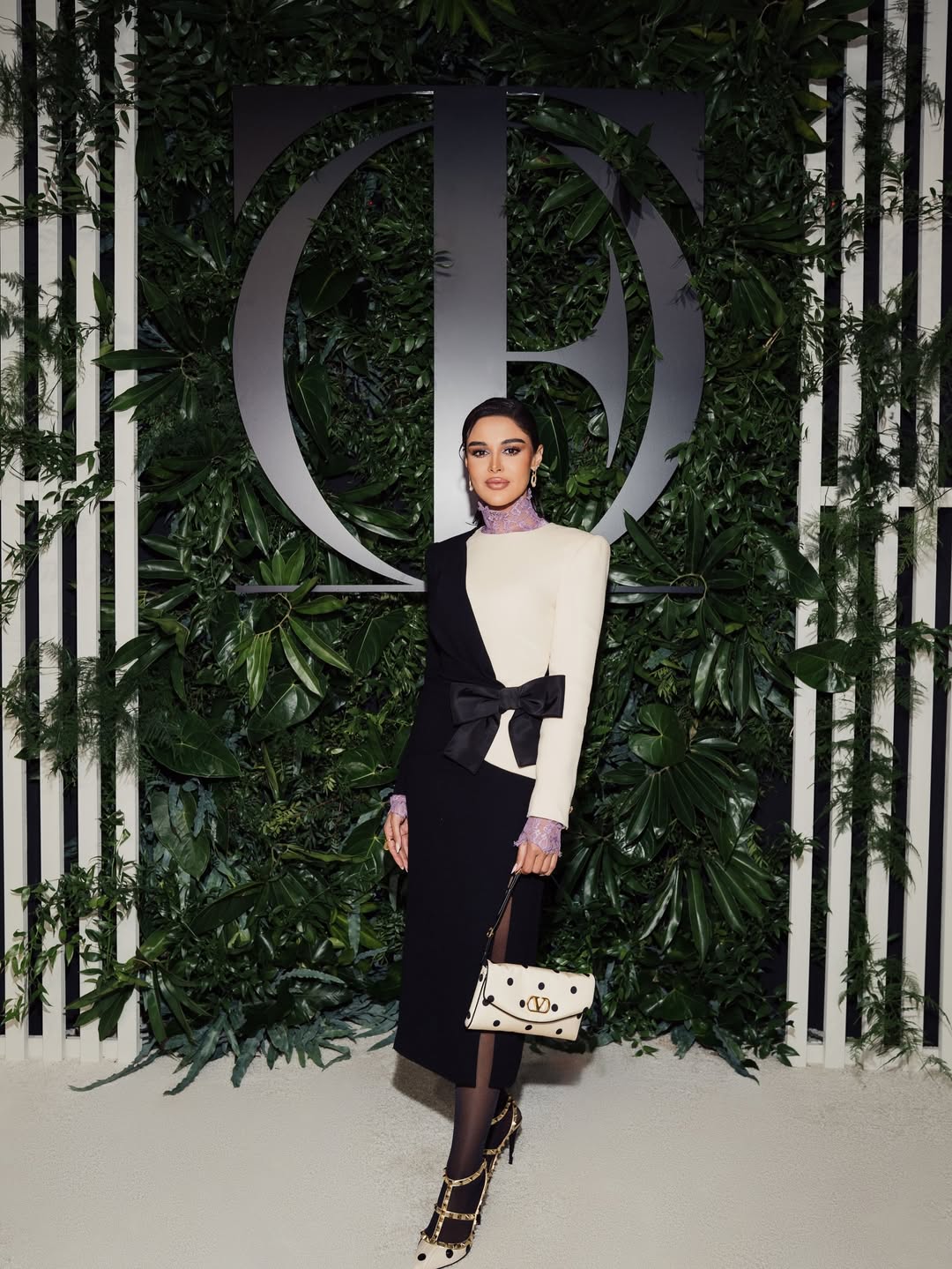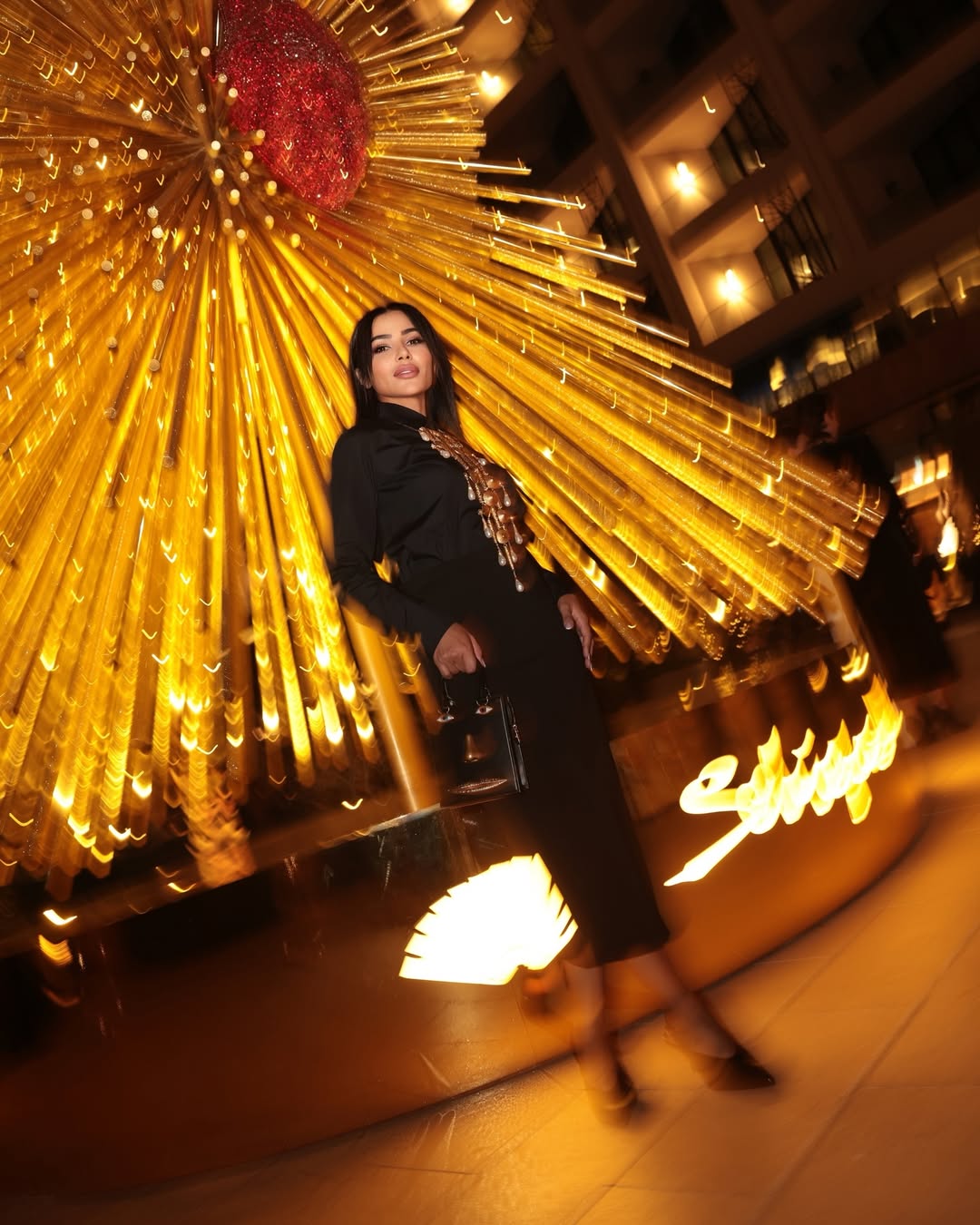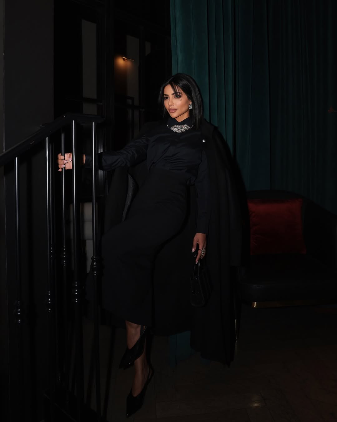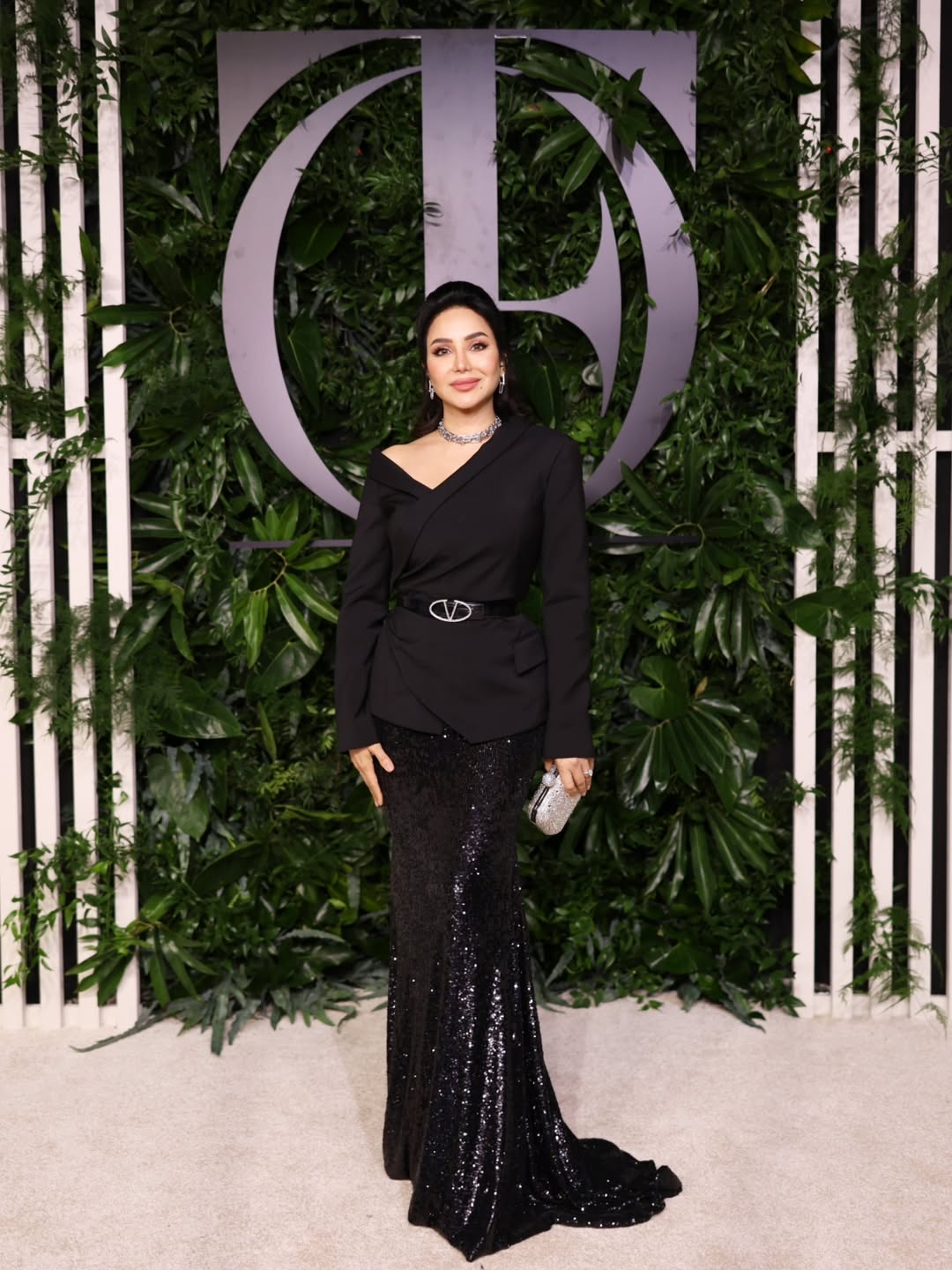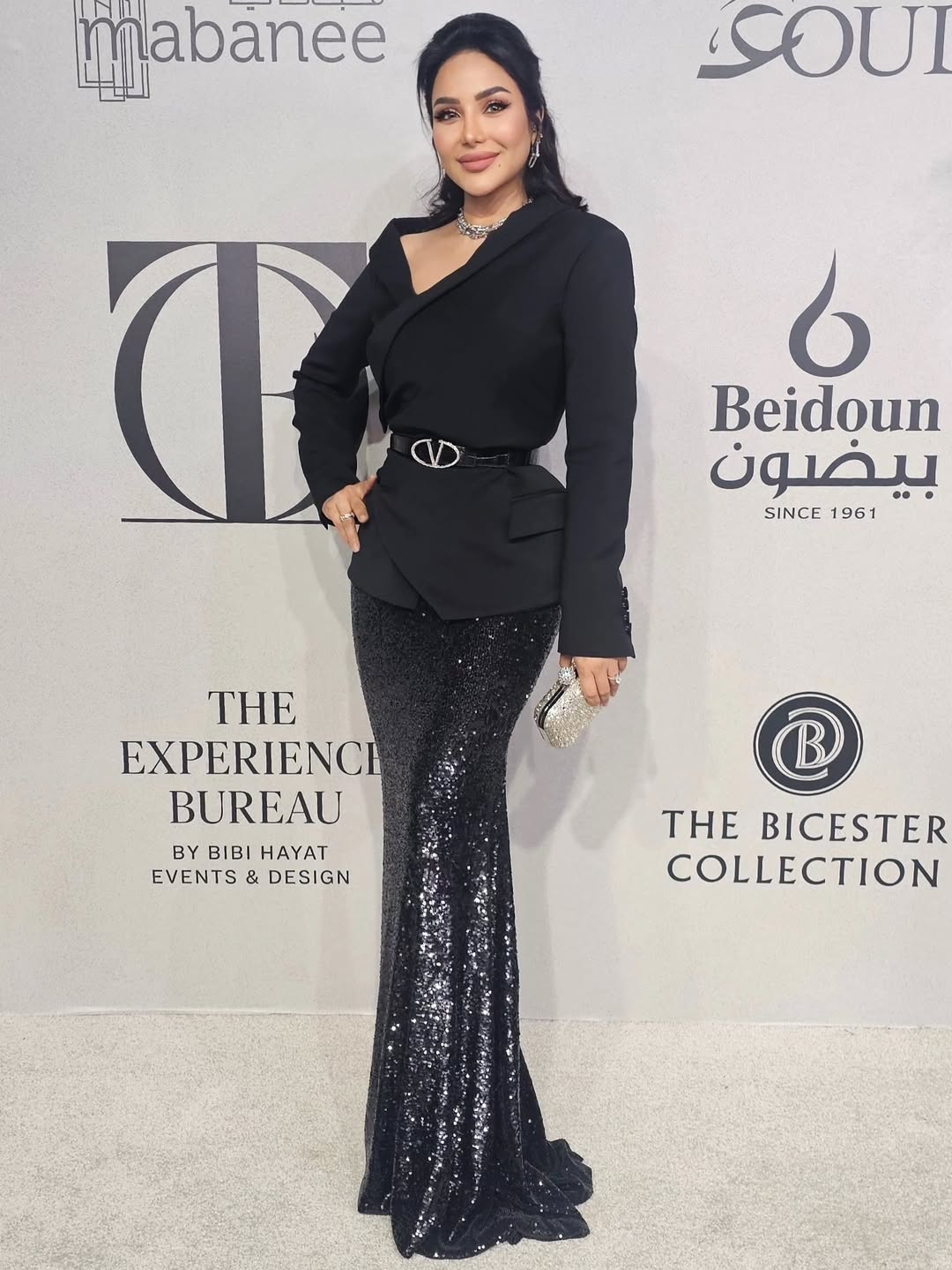 ظهرت لجين عمران بإطلالة مسائية فاخرة بالكامل باللون الأسود، من تنورة ماكسي مرصعة بالترتر حتى الذيل الطويل. نسّقت معها بليزر مجسم بفتحة كتف جذابة، وأضافت كلاتش كريستالي ومجوهرات فضية ماسية من Tiffany & Co. إطلالة تعكس قوّة اللون الأسود حين يقدَّم بذكاء.