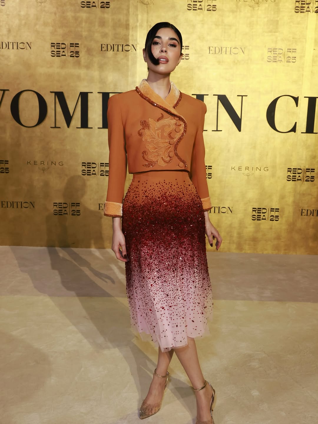 في فعالية "المرأة في السينما"، ارتدت زينة مكي بدلة تنورة فاخرة من جورج حبيقة، بقصّات لونية متدرجة بين البرتقالي والوردي وتطريزات برّاقة. جاكيت قصير متناسق وحذاء شفاف مرصع بالكريستال أكملا إطلالة مسائية تُشبه لوحة فنية.
