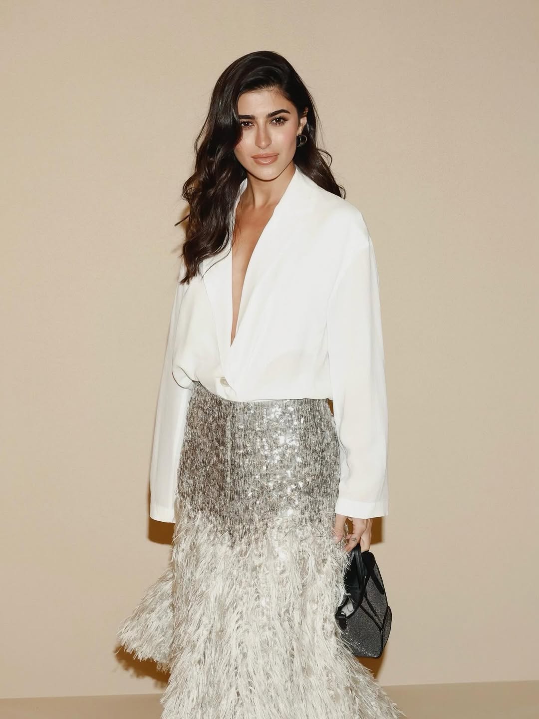 تألقت ديما الشيخلي بتنورة ميدي منتفخة مطرّزة بالترتر وبتفاصيل من الريش الأبيض عند الأطراف. الستايل المنسق مع بلوزة أوفر سايز بيضاء أضفى عليها حضورًا عصريًا ناعمًا، اكتمل بحذاء رمادي وحقيبة سوداء مرصّعة، مع تسريحة ويفي هادئة أقرب إلى البساطة الراقية.