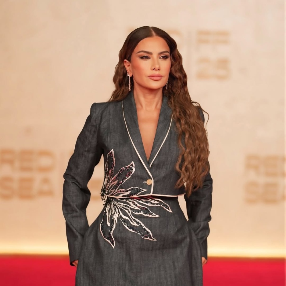 أبهرت صبا مبارك ببدلة تنورة بالرمادي، مع تنورة ميني مزينة بتطريز زهري جانبي وجاكيت قصير أنيق. نسقت مجوهرات ماسية وتسريحة كيرلي طبيعية، ما أضفى توازنًا بين القوة والأنوثة الجذابة.