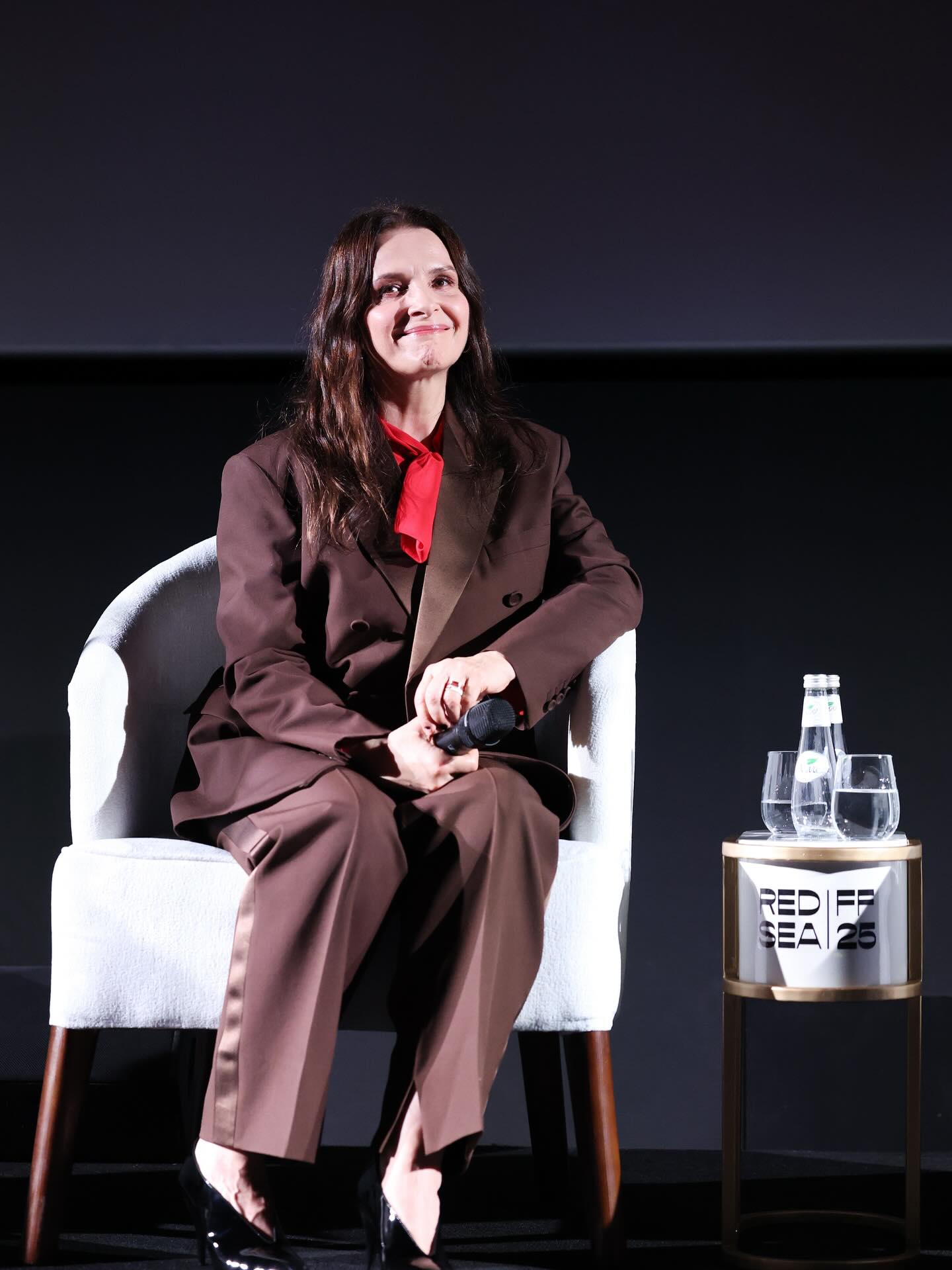 اختارت جولييت بينوش بدلة رسمية باللون البني الداكن، نسّقتها مع قميص أحمر قانٍ أضفى حيوية مدروسة على الإطلالة. التصميم جاء مريحًا وأنيقًا في آن، مع حذاء أسود بكعب متوسط عزز الطابع الرسمي.