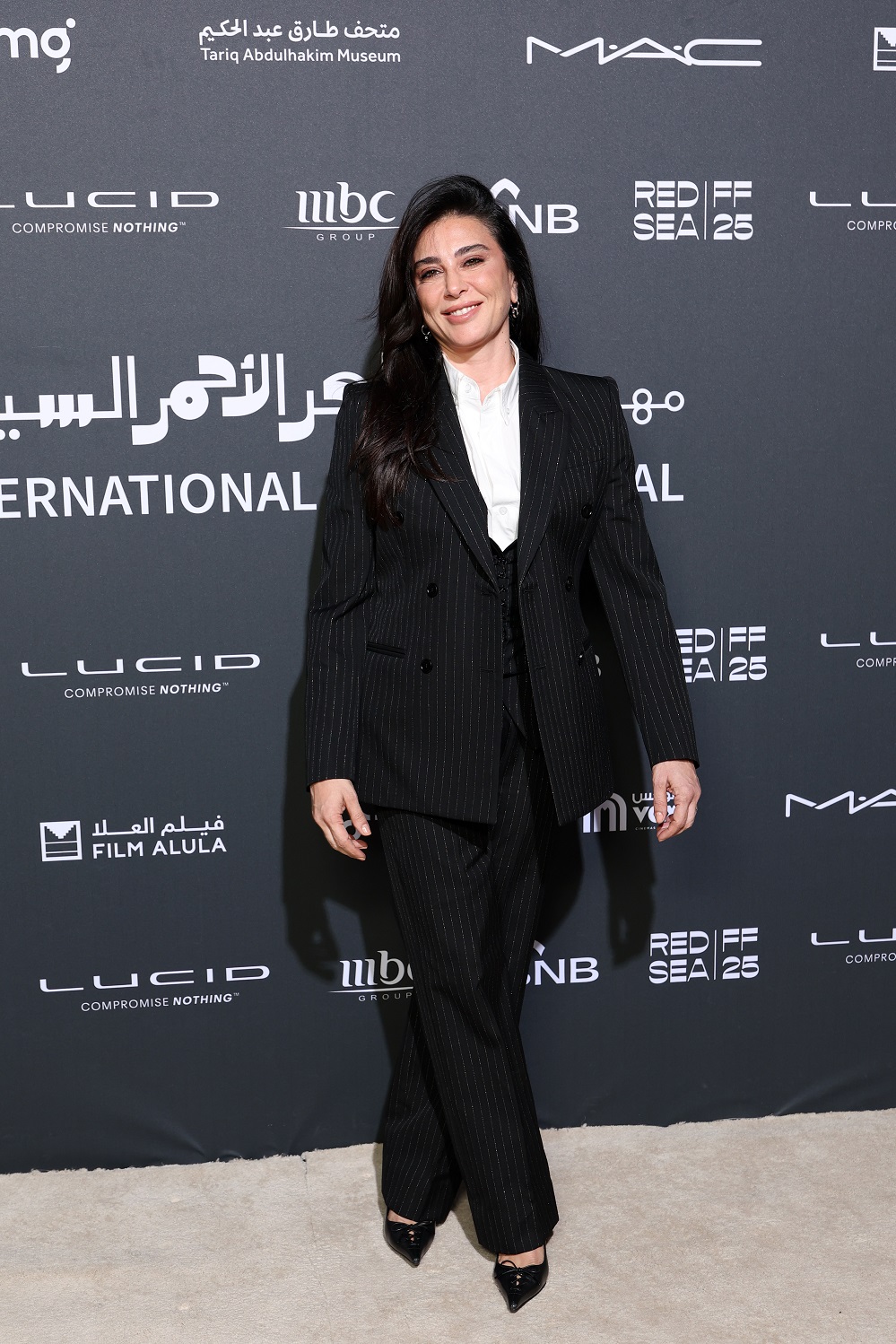 اختارت نادين لبكي بدلة سوداء مخططة بقصة مستقيمة وبنطال واسع، نسّقتها مع قميص أبيض بسيط وحذاء مدبب لامع، لتحقق توازنًا أنيقًا بين الكلاسيكية والحداثة.