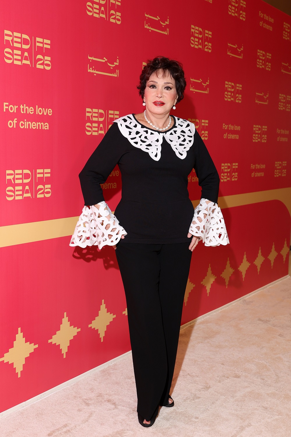 أطلت لبلبة بإطلالة سوداء راقية جمعت بين الكلاسيكية والحداثة، مع بلوزة ناعمة بياقة بيضاء هندسية مفرغة وأكمام واسعة مزينة بالكشكش، نسّقتها مع بنطال مستقيم القصة منحها حضورًا متوازنًا يعكس بساطتها الراقية.