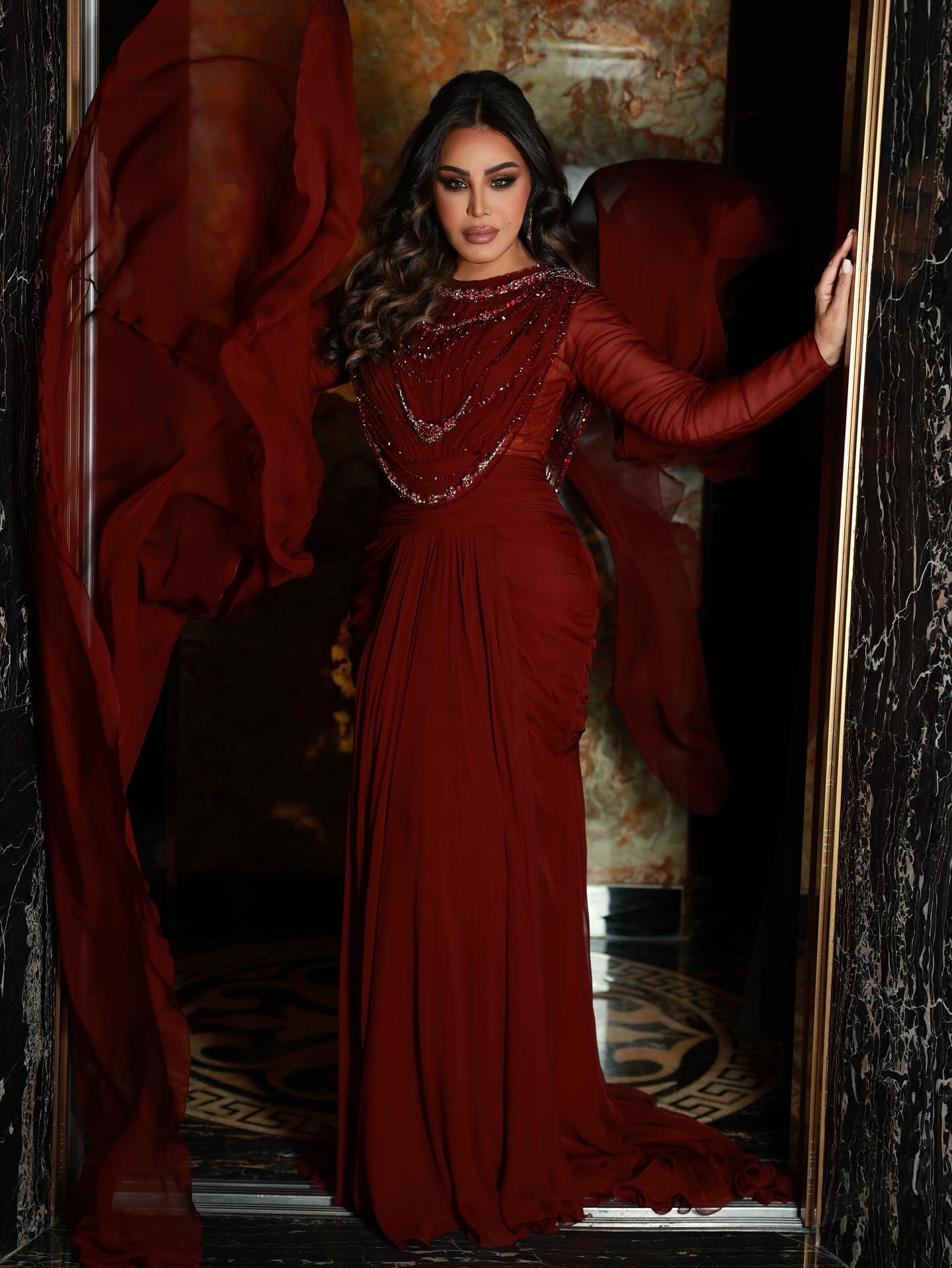 في ظهور سابق، اختارت أحلام فستانًا برغنديًا آخر، تميز بطيات ناعمة وتطريزات خرز وكريستال توزعت على الصدر والأكتاف بأسلوب يشبه العقود المتدلية. الأكمام الشيفون الشفافة والأقمشة الخلفية المنسدلة كالأجنحة منحت الفستان حضورًا مهيبًا يليق بنجمة تعرف كيف تملأ المسرح.