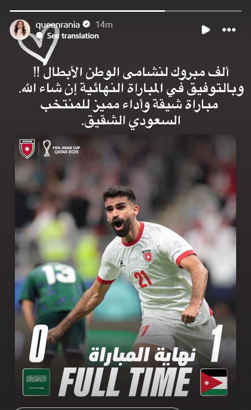 ونشرت جلالتها رسالة على حسابها الرسمي، قالت فيها: "ألف مبروك لنشامى الوطن الأبطال !! وبالتوفيق في المباراة النهائية إن شاء الله".