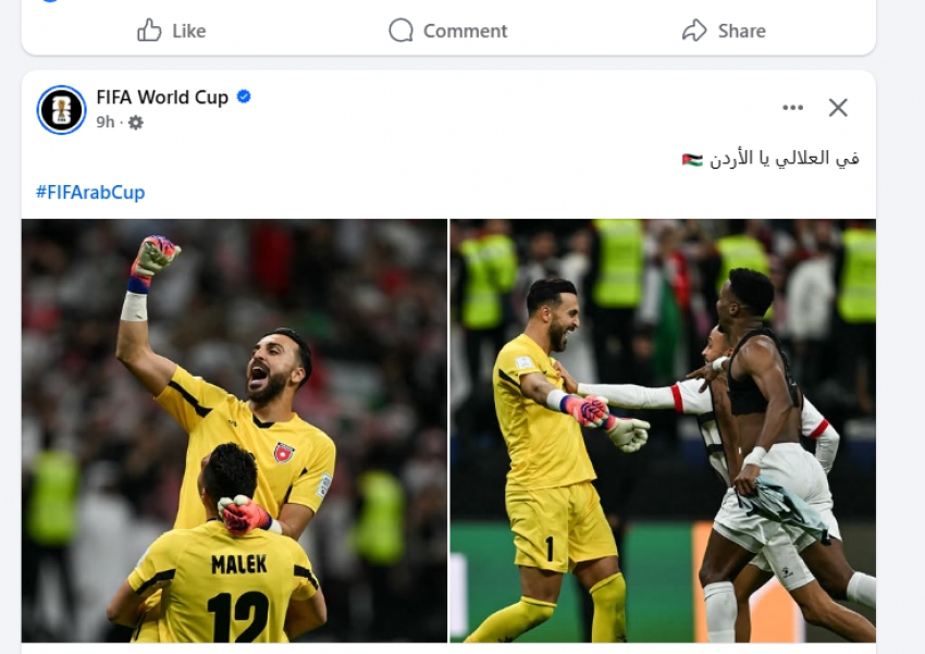ونشرت الصفحة الرسمية الناطقة باللغة العربية، صورًا من فرحة لاعبي المنتخب الوطني بفوزهم على المنتخب السعودي في نصف نهائي بطولة كأس العرب فيفا قطر 2025 وبلوغهم المباراة النهائية.