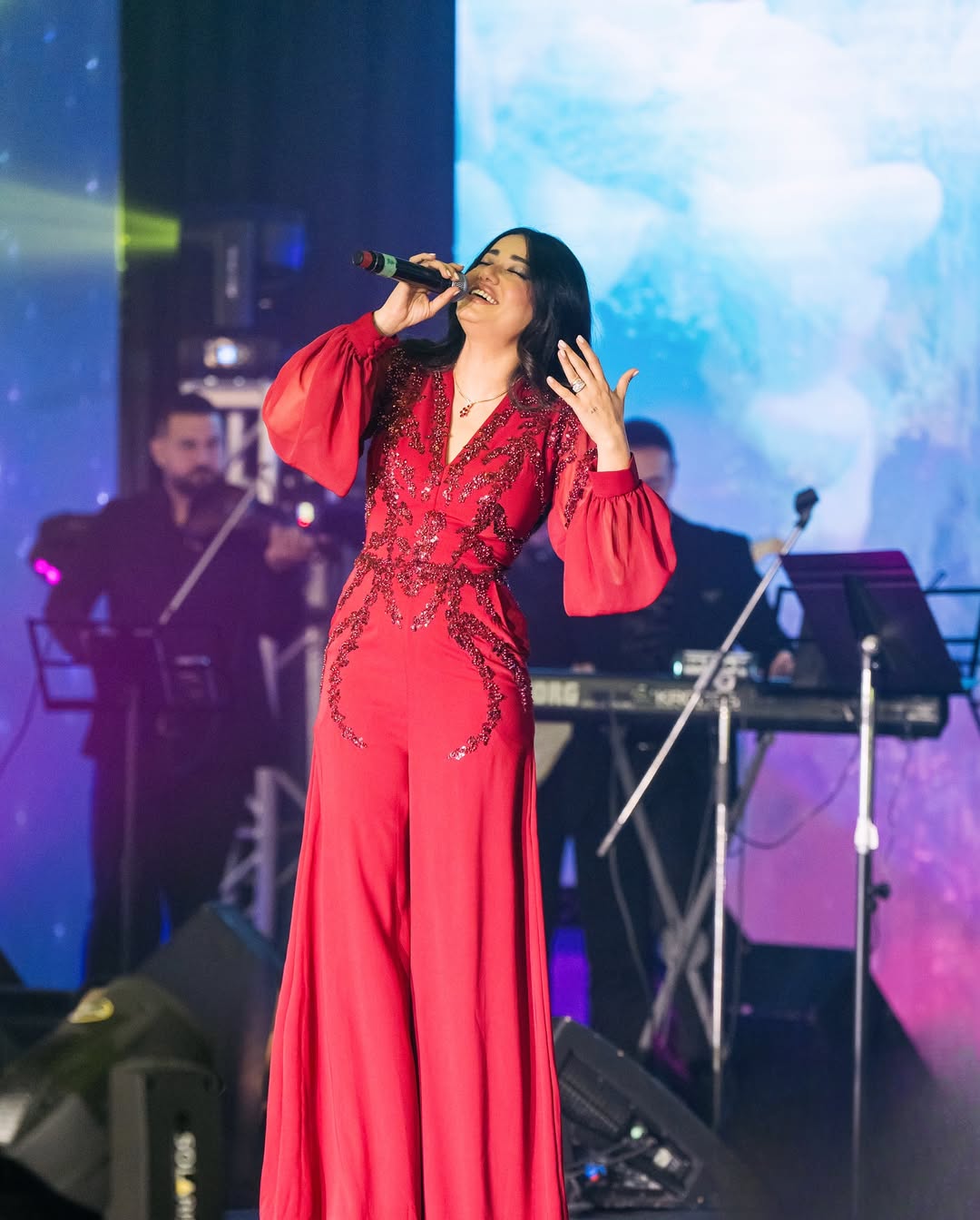 رغم أن الجمبسوت لم يكن القطعة الأكثر تكرارًا في إطلالات رحمة رياض خلال 2025، إلا أنها اختارته بعناية في المناسبات الخاصة. جمبسوتها الأحمر من توقيع سعيد قبيسي، بتصميم الأرجل الفضفاضة والخصر المحدد والتطريزات الراقية، كان مثالًا على كيف يمكن لقطعة واحدة أن تختصر الأناقة والقوة في آن واحد.