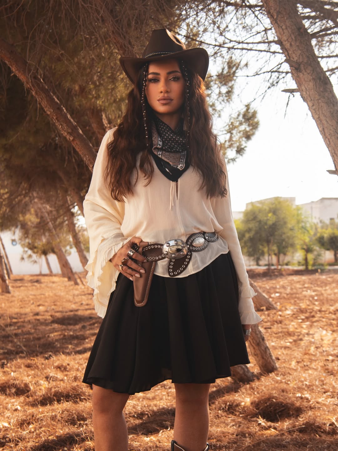 التنورة كانت من القطع التي لعبت دورًا بارزًا في إطلالات رحمة رياض اليومية. اعتمدت ستايل الكاوبوي بتنورة قصيرة سوداء مع بلوزة بيضاء واسعة الأكمام، وحزام جلدي مرصع، وسكارف حول العنق، لتقدم إطلالة حيوية تحمل طابعًا مغامرًا.