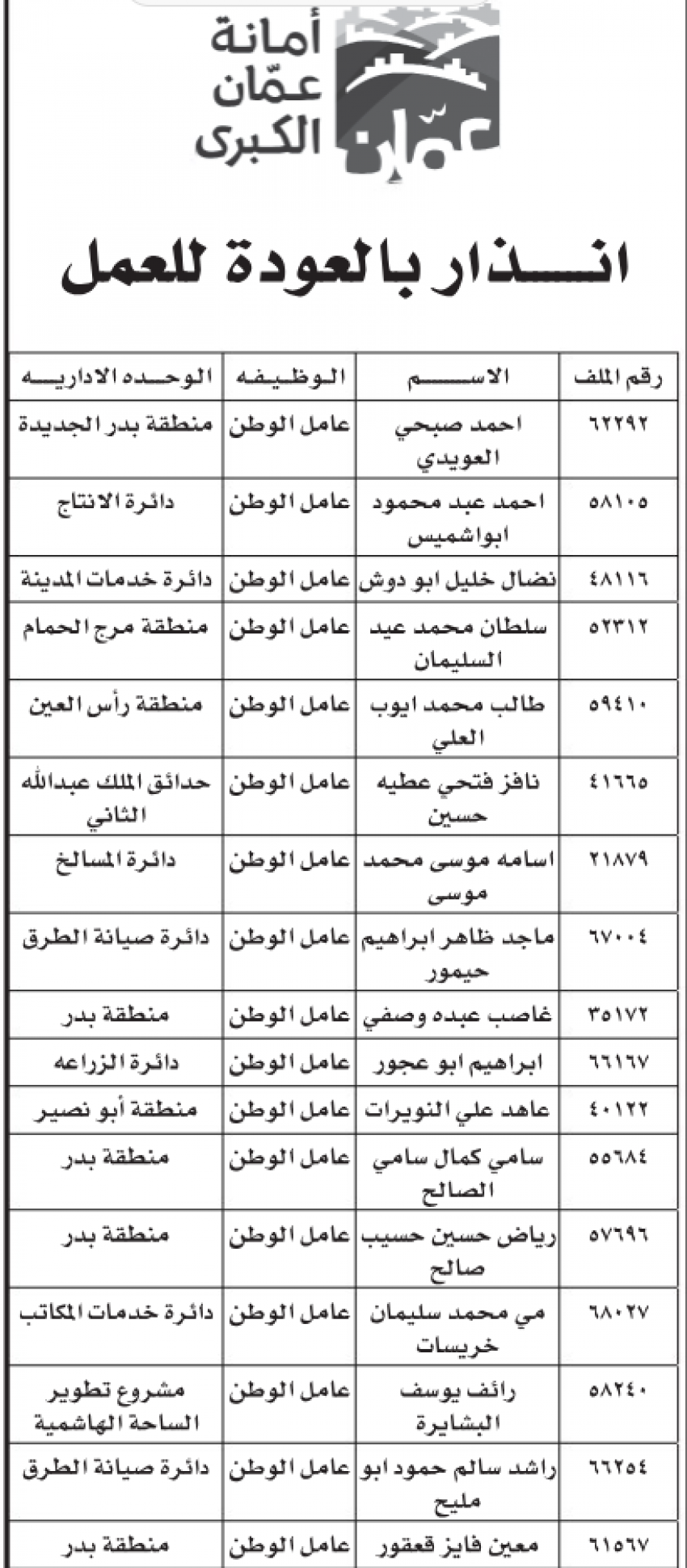 للعلّم - أنذرت أمانة عمان الكبرى عددًا من عمال الوطن بضرورة العودة إلى عملهم خلال مدة لا تتجاوز 3 أيام، والا تعرضوا للفصل.