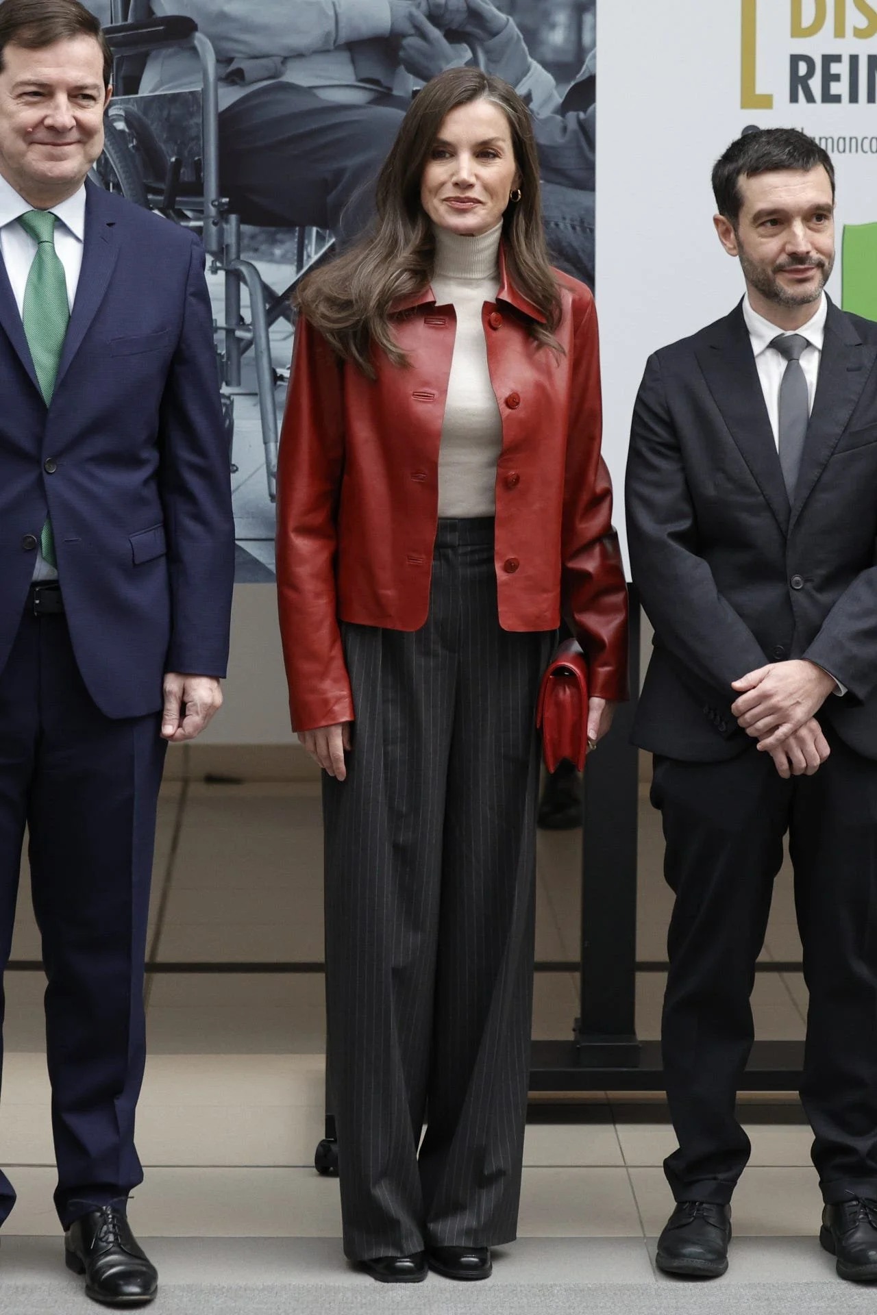 الرزانة لا تعني الملل، وهذا ما تثبته الملكة ليتيزيا في كل ظهور. خلال حفل توزيع الجوائز الوطنية لذوي الإعاقة في سالامانكا، كسرت البروتوكول الملكي بجرأة محسوبة، مرتدية سترة جلدية قصيرة باللون الأحمر القرمزي.