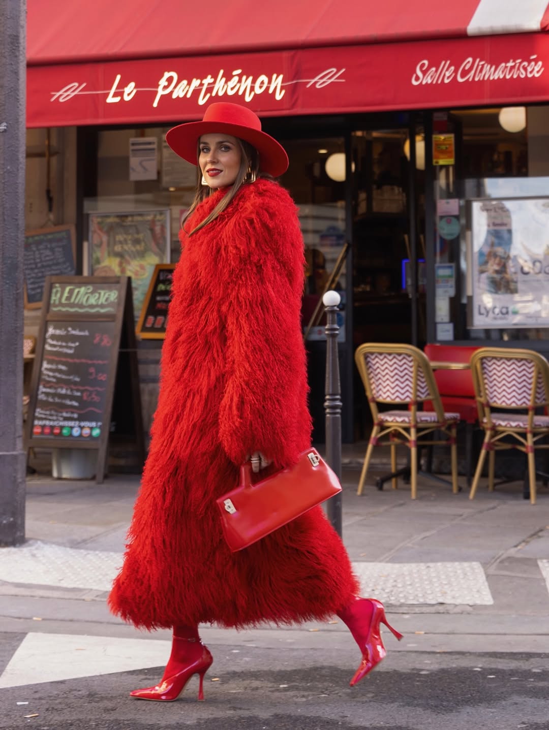 قدّمت نينا ساندبيك مثالًا مثاليًا على كيفية اعتماد اللون الأحمر في الإطلالات اليومية الشتوية بأسلوب ستريت ستايل راقٍ. المعطف الطويل المصنوع من الصوف بشعيراته البارزة جاء بقصة أوفر سايز تمنح الدفء والفخامة، ونسّقته مع جوارب عالية وحذاء جلدي لامع بنفس اللون. القبعة الحمراء المستديرة أضافت بعدًا عصريًا جريئًا، بينما حافظت الأقراط الذهبية وتسريحة الشعر المالس على بساطة متوازنة تمنع الإطلالة من المبالغة.
