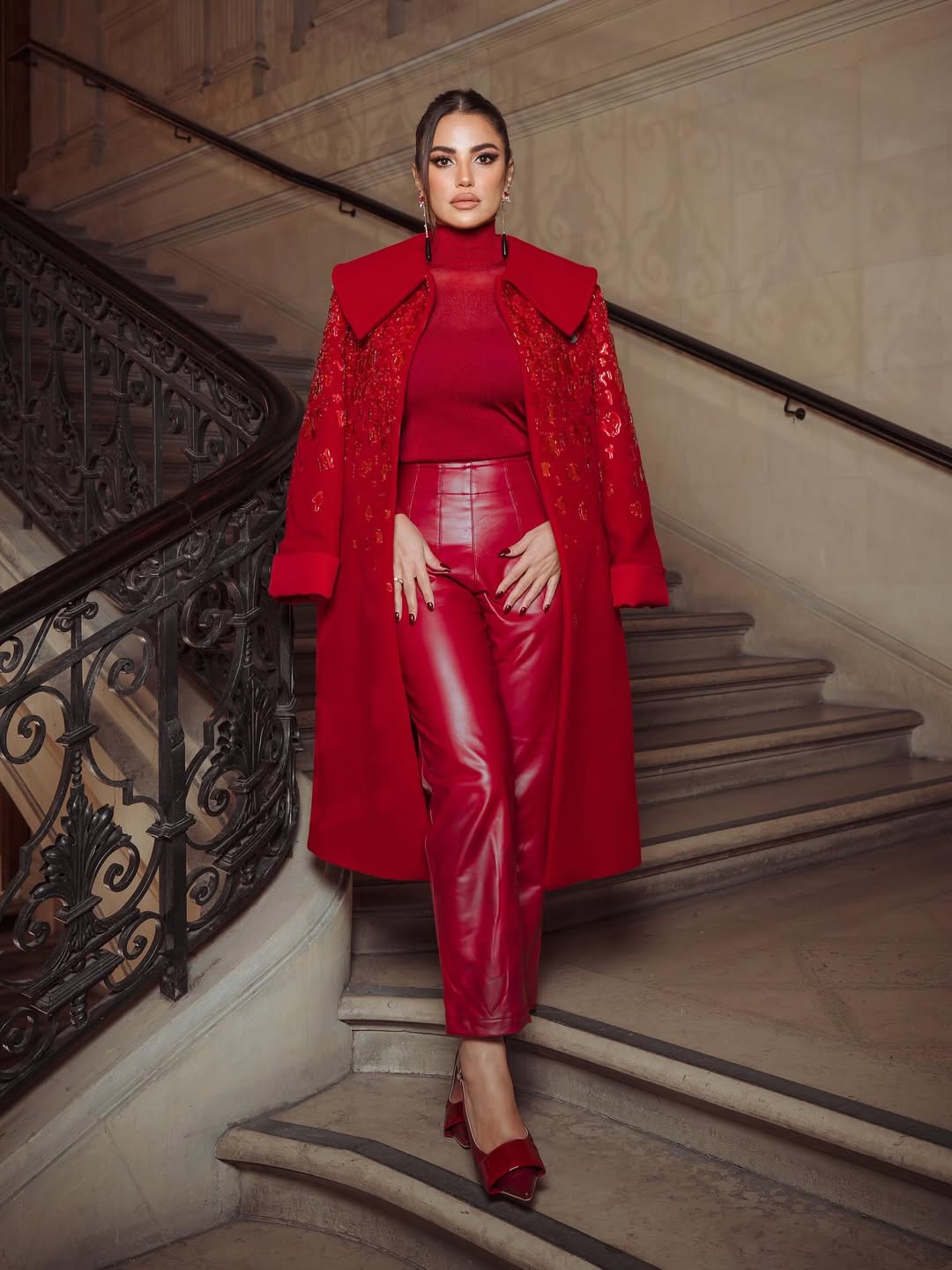 الفنانة درة برهنت على قدرتها في تنويع تنسيقات اللون الأحمر بأسلوب راقٍ. في إطلالتها الأولى، اعتمدت بنطال جلد أحمر عالي الخصر مع بلوفر ومعطف صوفي بنفس اللون من توقيع جورج حبيقة، حيث لعبت على تدرّجات الخامات لإثراء المظهر. التطريزات الجلدية عند الكتفين أضافت بعدًا فاخرًا، فيما أكملت الحذاء المدبب وتسريحة الكعكة العالية اللوك بأناقة واضحة. وفي ظهور آخر، اختارت درة بنطال جلد ضيق مع بلوفر صوفي واسع، لتؤكد أن الأحمر المونوكروم يصلح أيضًا لإطلالات أكثر بساطة وعملية من دون فقدان الأناقة.