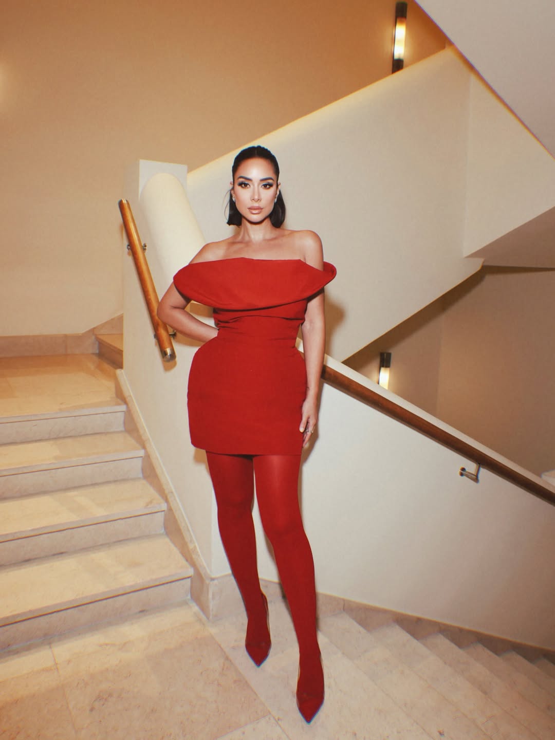 في إطلالة تعبّر عن الجرأة والثقة، اختارت مرمر تنسيقًا مونوكروم أحمر من توقيع Bouguessa. الفستان المجسم بطول الكاحل والياقة العالية شكّل قاعدة أنيقة، بينما أضاف البليزر الأوفر سايز المفتوح حيوية وعصرية للّوك. الحذاء الميتاليك من Louboutin والجوارب الحمراء العالية عززا من قوة الإطلالة، في حين جاءت فيونكات الشعر الحمراء كلمسة شبابية ذكية كسرت رسمية اللوك وأضافت إليه طابعًا مرحًا يناسب أجواء الأعياد.