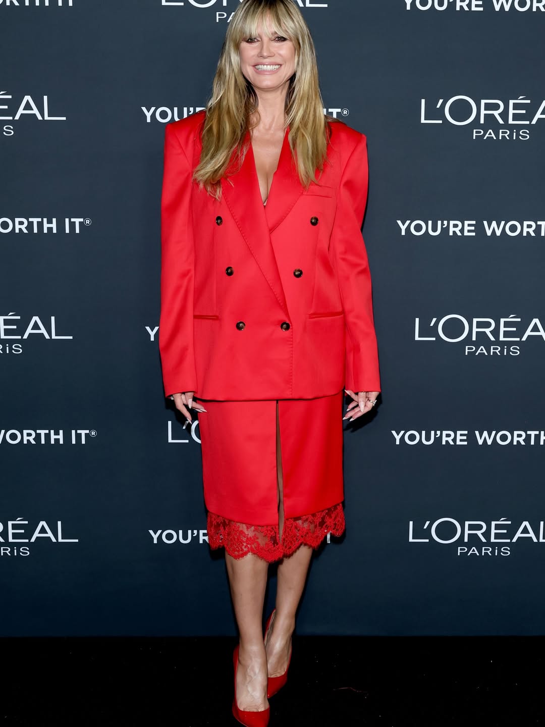 تثبت هايدي كلوم أن البدلة النسائية الحمراء يمكن أن تكون خيارًا جريئًا وأنيقًا في الوقت نفسه. اختارت جاكيت أوفر سايز بخط مزدوج من الأزرار السوداء، ما أضفى تباينًا أنيقًا كسر حدّة اللون، مع تنورة ميدي مزينة بشريط دانتيل وفتحة أمامية عالية أضافت لمسة أنثوية جذابة. الحذاء الأحمر المدبب حافظ على وحدة اللون، بينما جاء غياب الإكسسوارات الكثيفة ليمنح الإطلالة طابعًا واثقًا وغير متكلف.