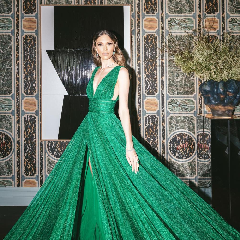 بعيداً عن الطبعات، تُظهر بيتينا عشقاً واضحاً للألوان القوية والمشرقة. من أبرز إطلالاتها فستان أخضر زمردي لامع من توقيع Dolce&Gabbana، جسّد الفخامة الإيطالية بأسلوب ملوكي. القصة الانسيابية مع التنورة الواسعة أضفت حركة درامية أنيقة، بينما أبرزت ياقة الـV العميقة والخصر المحدد أنوثتها بثقة. واختارت مجوهرات ماسية ناعمة، في تنسيق يؤكد فهمها العميق لفكرة “الأقل هو الأكثر”.