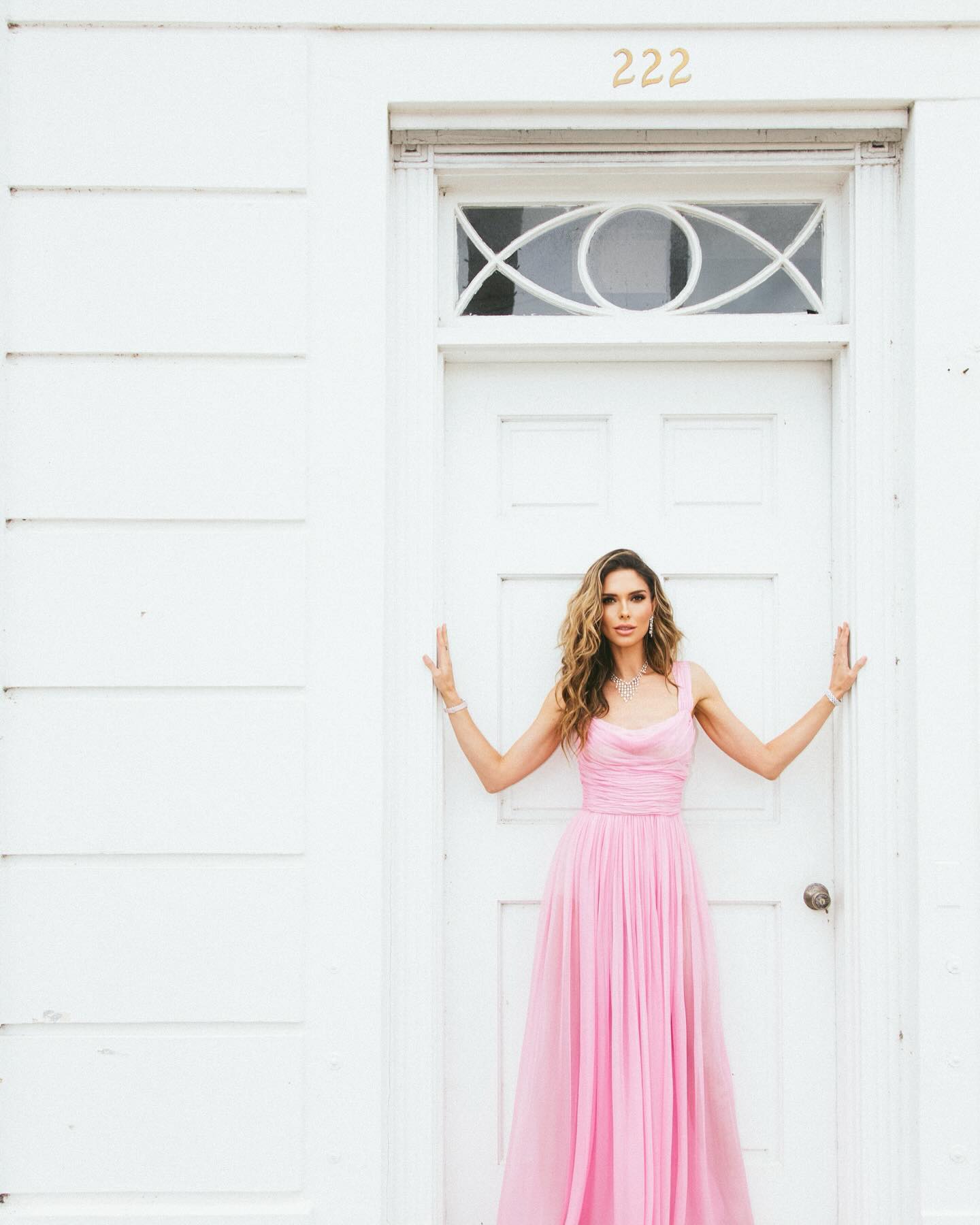وفي ظهور آخر من الدار نفسها، تألقت بفستان وردي باستيلي طويل، جاء بتصميم ناعم يعكس الرقي والبساطة. الأكتاف المكشوفة والأكمام القصيرة أضافت طابعاً رومانسياً، فيما منح القماش المتدفق الإطلالة إحساساً شاعرياً مثالياً للمناسبات النهارية الراقية.