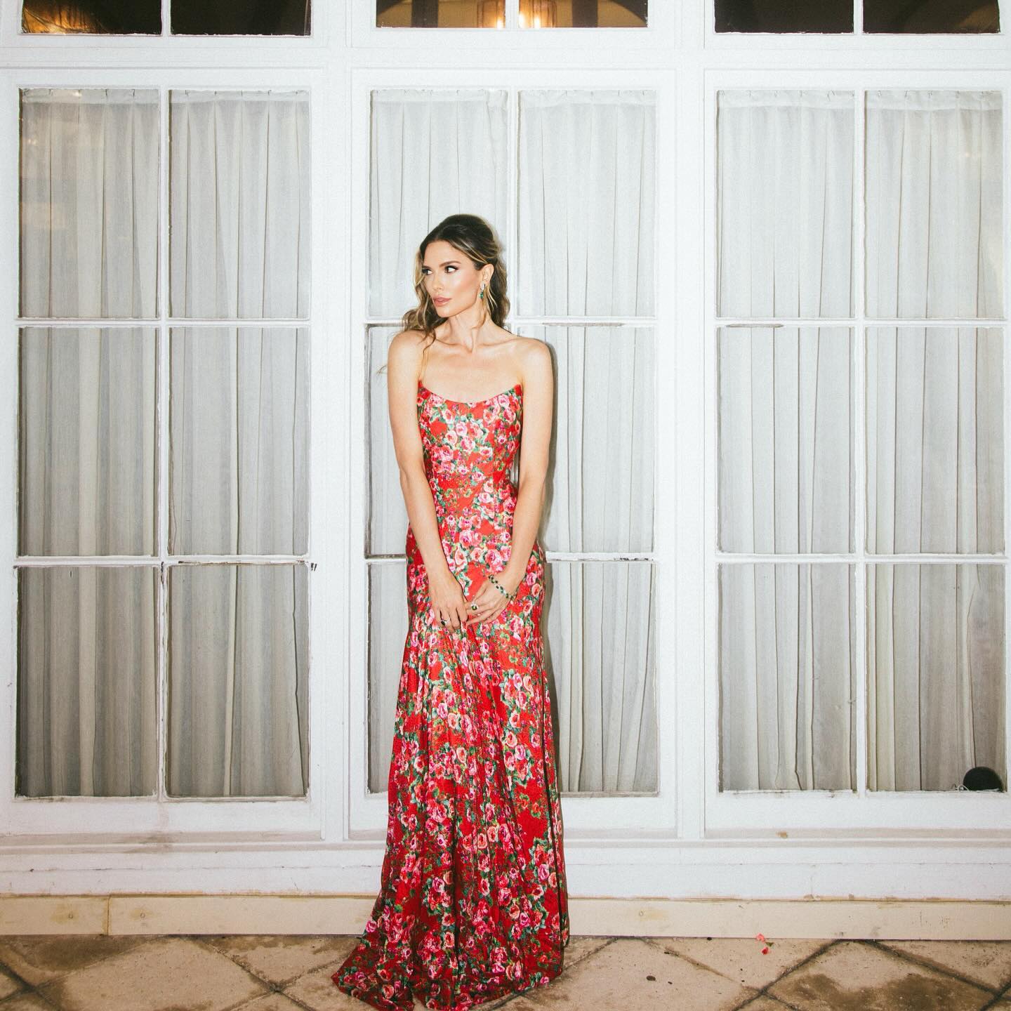 لا تبتعد بيتينا أندرسون عن الرومانسية، لكنها تقدّمها دائماً بروح عصرية. في فستان من توقيع Markarian، اختارت اللون الأحمر المائل إلى الوردي مع طبعات زهرية دقيقة، في تصميم طويل يبرز الخصر وينسدل بنعومة نحو الأسفل. الأشرطة الرفيعة على الكتفين أضفت خفة وأناقة، فيما منح القماش اللامع الخفيف الإطلالة بريقاً ناعماً مناسباً للأمسيات الراقية. المجوهرات الذهبية البسيطة جاءت كخيار ذكي يحافظ على توازن الإطلالة ويترك للتصميم مساحة التألق.