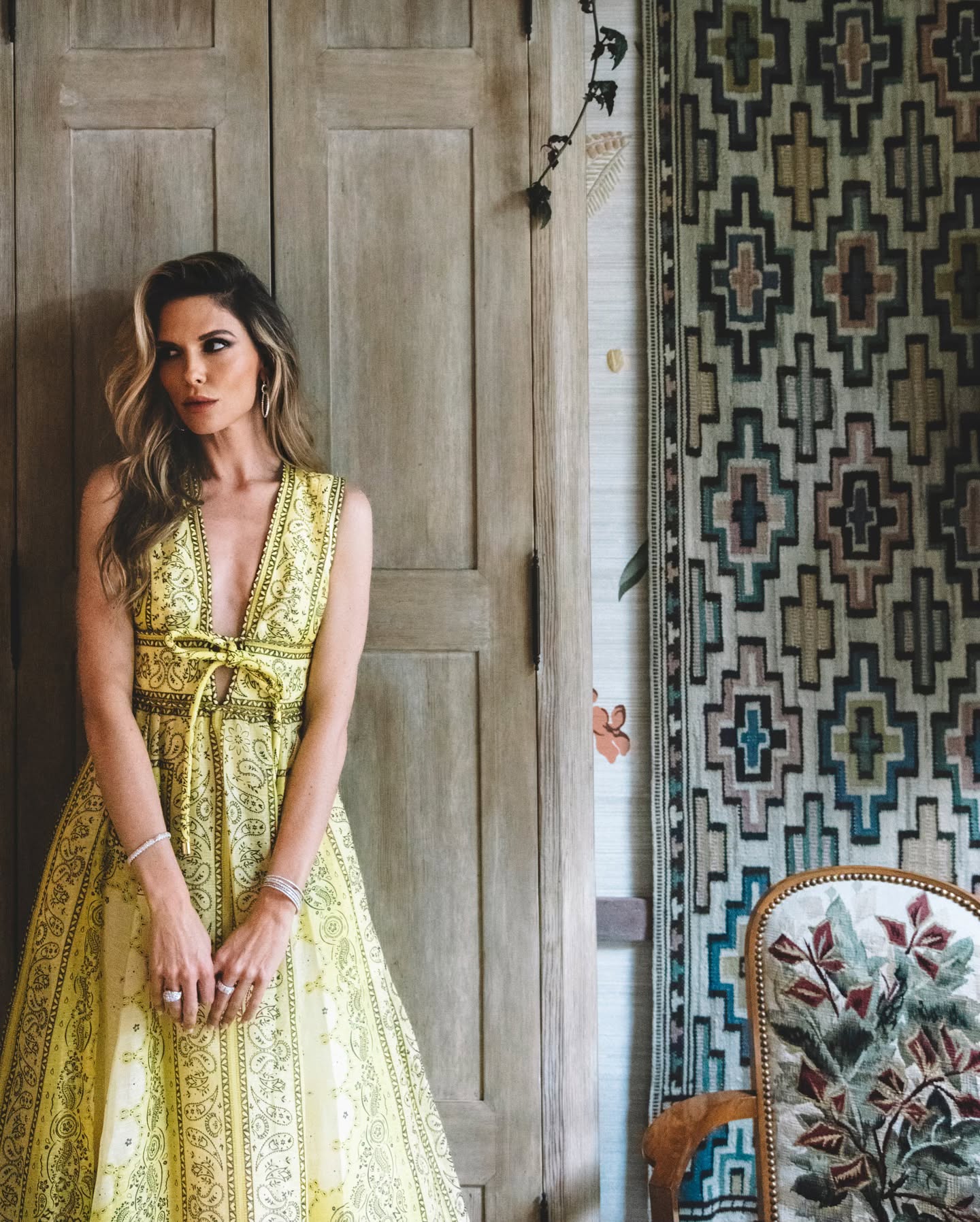 تُعد الإطلالات المطبّعة جزءاً أساسياً من هوية بيتينا الأنيقة، خصوصاً تلك التي تعكس أجواء الصيف والنهار. واحدة من أبرز هذه الإطلالات كانت بفستان من توقيع Zimmermann، حيث اختارت اللون الأصفر الذهبي المشرق، في تصميم طويل انسيابي يجسّد روح الدار الرومانسية. القصة الواسعة المنسدلة برقة على القوام، مع ياقة الـV العميقة، منحت الإطلالة توازناً مثالياً بين الجرأة والنعومة، بينما أضفى الحزام القماشي المعقود على شكل فيونكة لمسة أنثوية رقيقة أبرزت الخصر من دون مبالغة. النقوش الهندسية والزهرية الدقيقة على القماش أضافت عمقاً بصرياً وحيوية لافتة، في حين جاءت الأساور الفضية الرفيعة لتكمل الإطلالة ببريق هادئ يعكس ذوقاً راقياً بعيداً عن التكلف.