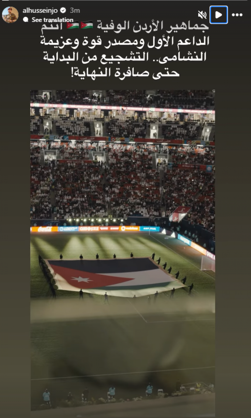 وكتب سمو ولي العهد عبر خاصية الستوري في منصة انستقرام" جماهير الأردن الوفية أنتم الداعم الاول ومصدر قوة وعزيمة للنشامى.. التشجيع من البداية حتى صافرة النهاية".