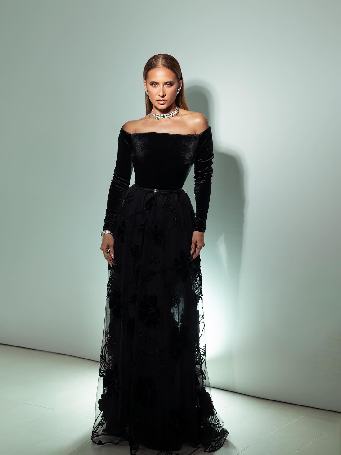 إحدى أجمل إطلالاتها هذا العام جاءت بتوقيع إيلي صعب: فستان أسود بمخمل فاخر وأكتاف مكشوفة، مع تول مطرز في الأسفل. درس واضح في كيف يمكن لإطلالة واحدة أن تكون كلاسيكية، عصرية، ومناسبة لأي مناسبة كبيرة… بما فيها العد التنازلي للعام الجديد.