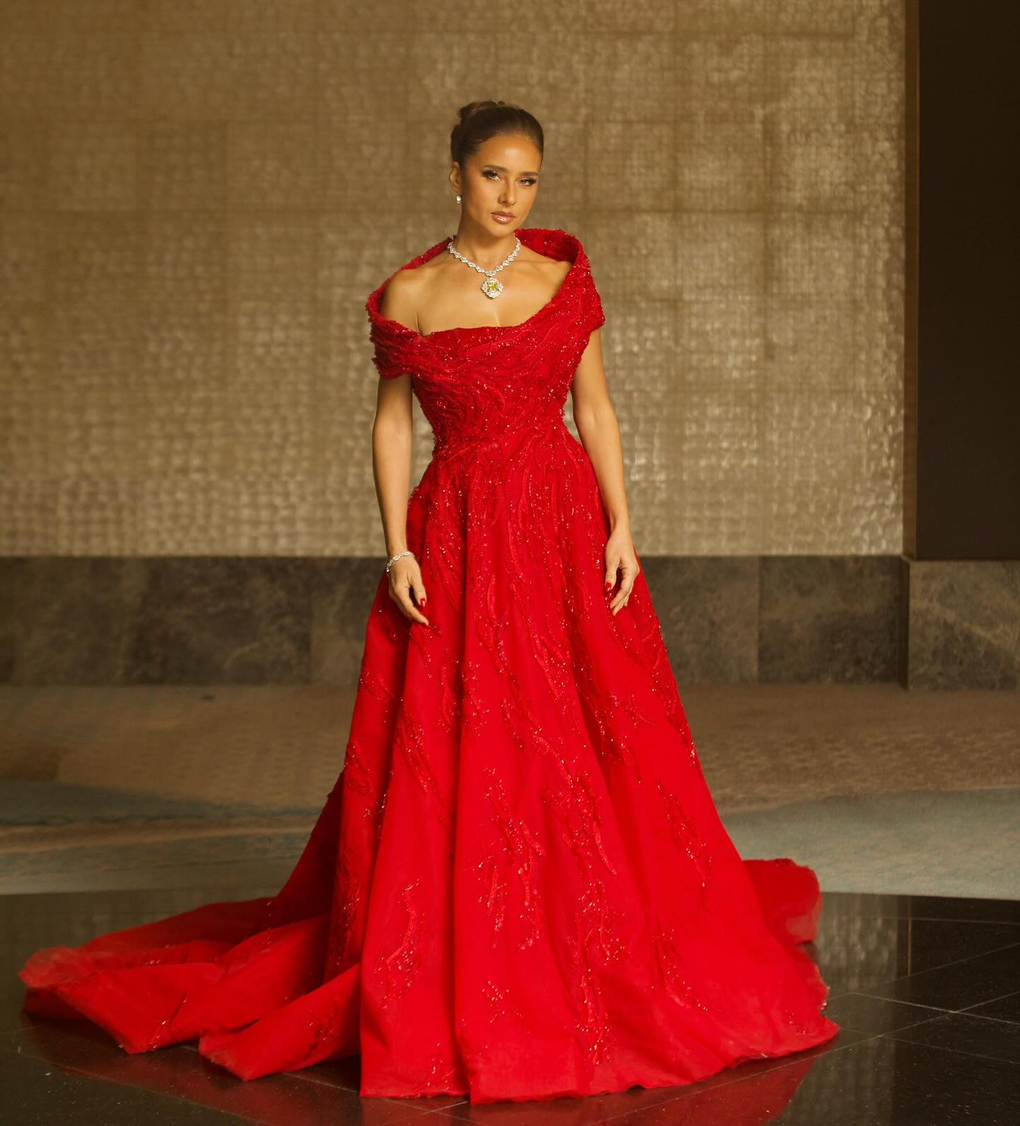 أما الفستان الأحمر الملكي، فكان لحظة «أنا هنا» بامتياز. تصميم يليق بالاحتفال، ويصلح تمامًا لسهرة رأس سنة تريدين فيها أن تكوني نجمة المشهد… بلا مجهود مبالغ فيه.