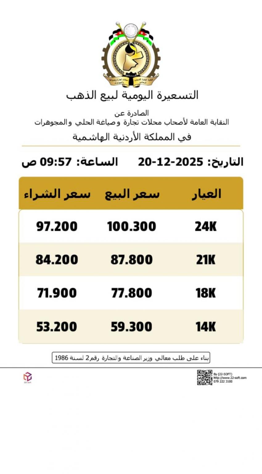 وبلغ سعر الغرام الواحد من الذهب عيارات 24 و18 و14 لغايات البيع من محلات الصاغة عند 100.30 و 77.80 و59.30 دينارا على التوالي.