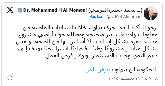 وقال المومني في منشور عبر منصة "إكس": إن الحكومة لن تتهاون مطلقًا مع أي جهة أو شخص يروّج لمعلومات كاذبة أو مضللة تمس مشاريع الدولة أو مؤسساتها أو أموال المواطنين، وكل من يثبت تورطه في نشر أو ترويج هذه الشائعات سيُحاسب ويُلاحق قانونيًا وفق أحكام القانون، دون استثناء أو تهاون.